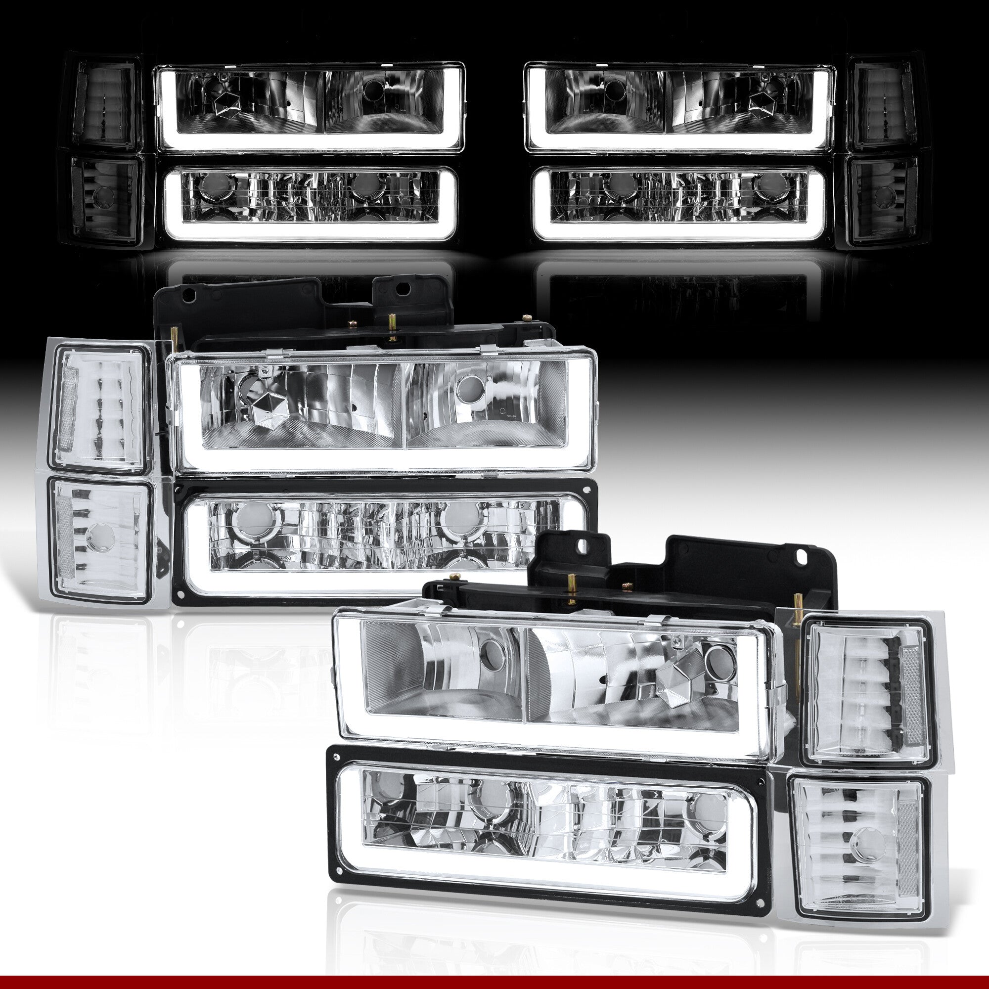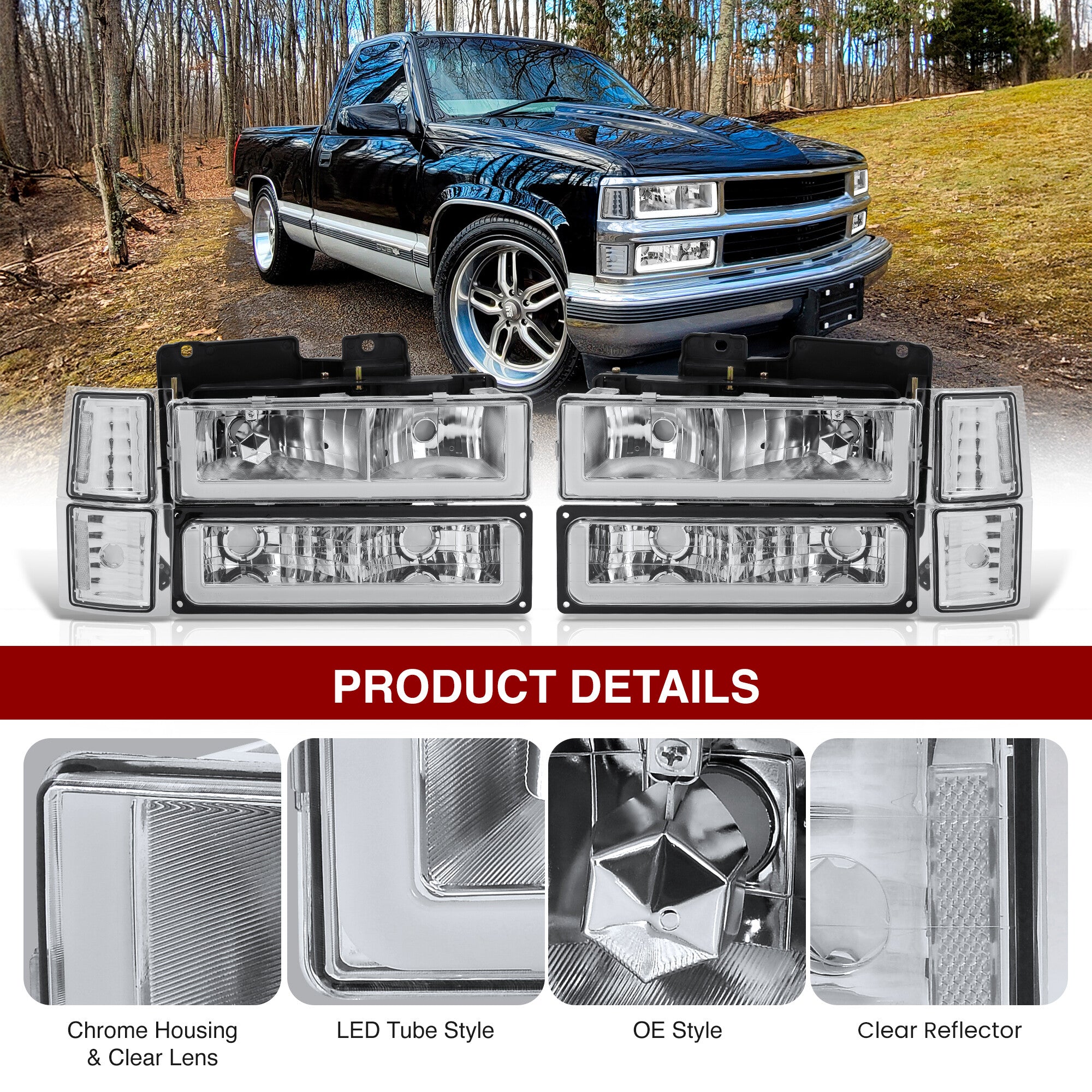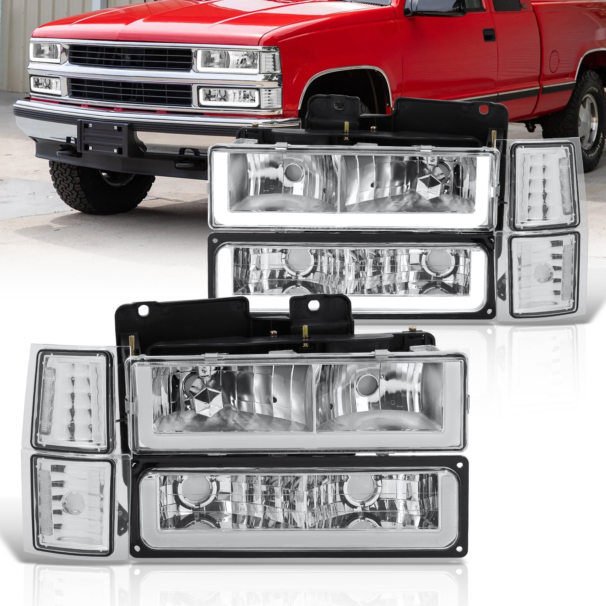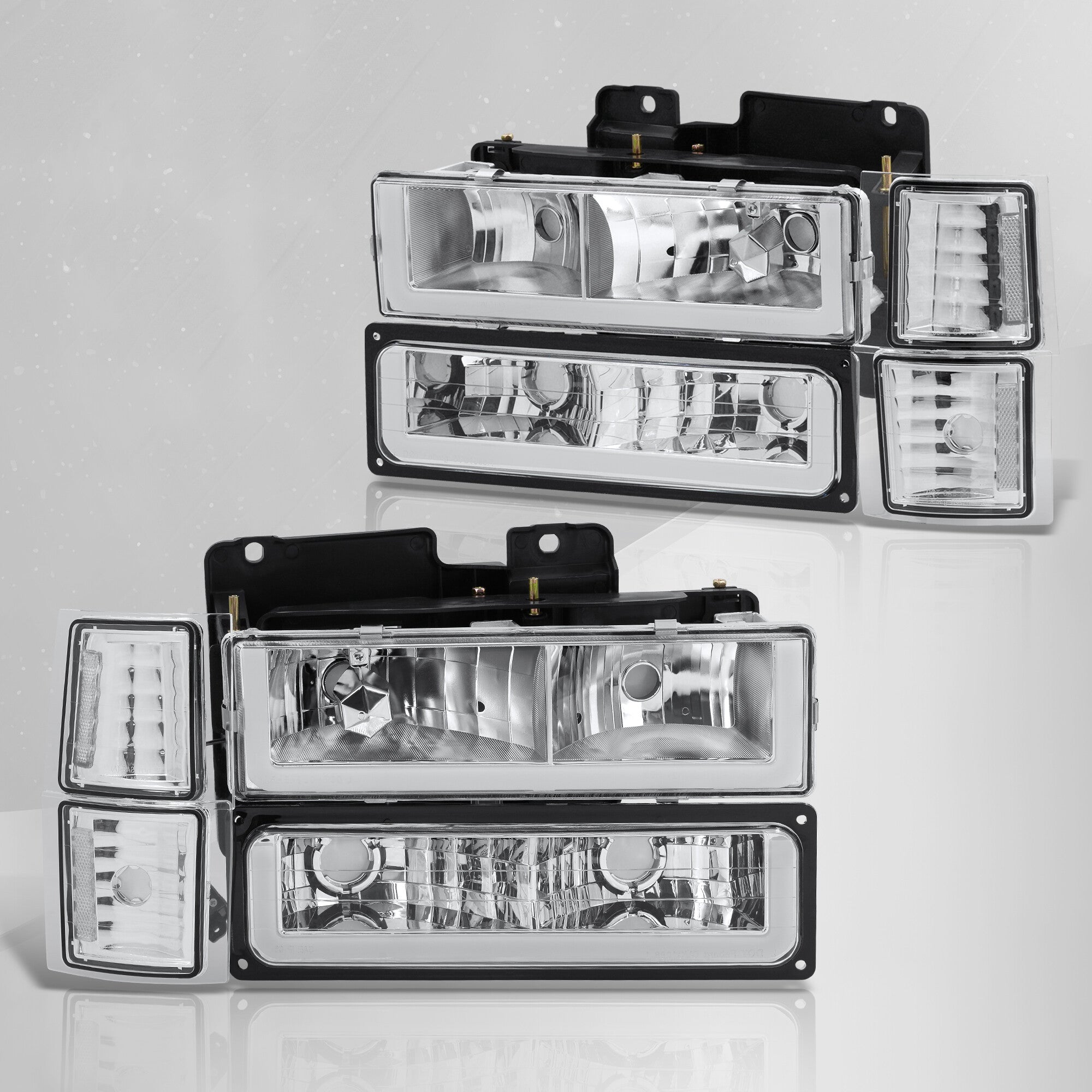 Chevrolet C/K 1500 2500 3500 1994-1998 LED DRL Bar Factory Style Headlights + Bumpers + Corners Chrome Housing Clear Len Clear Reflector
