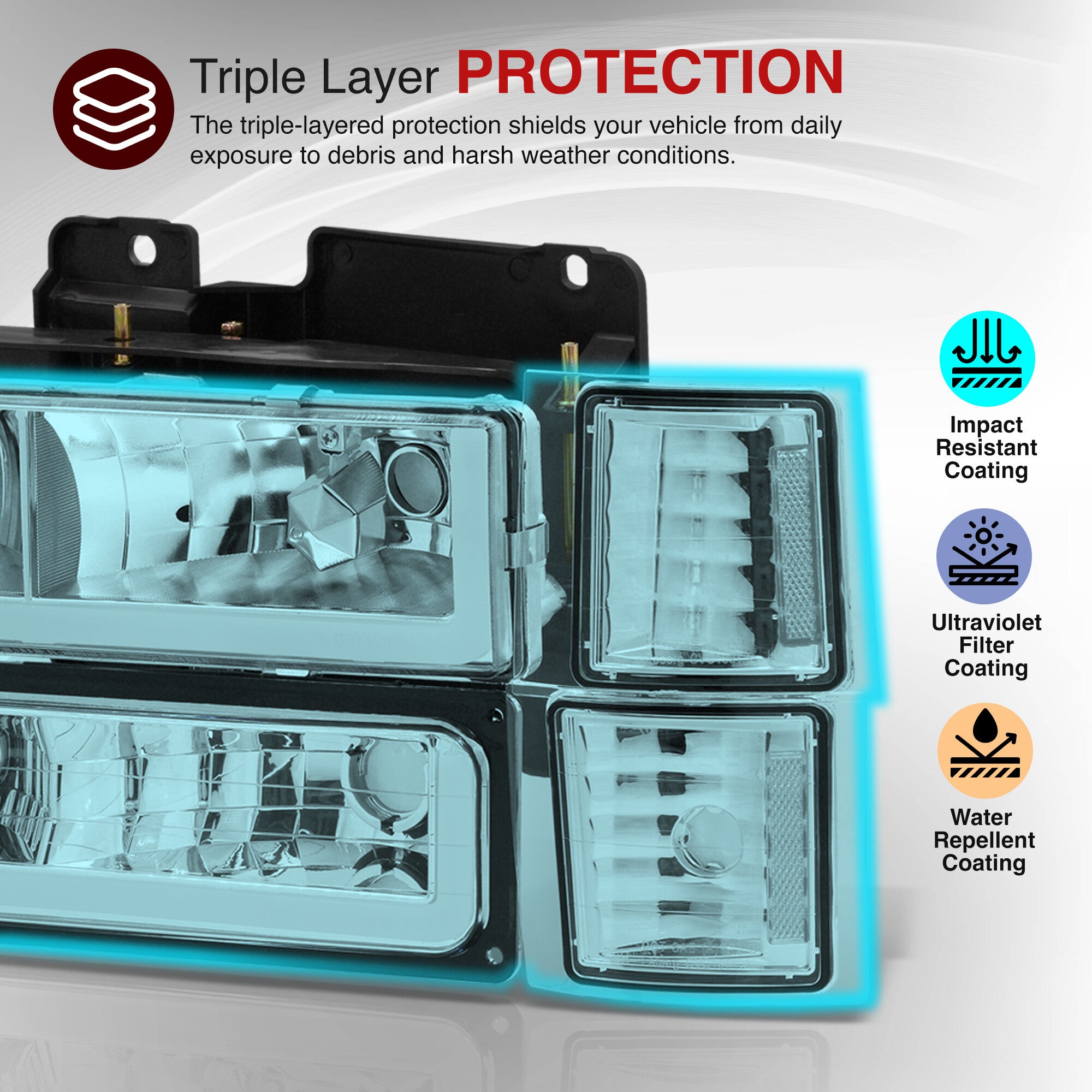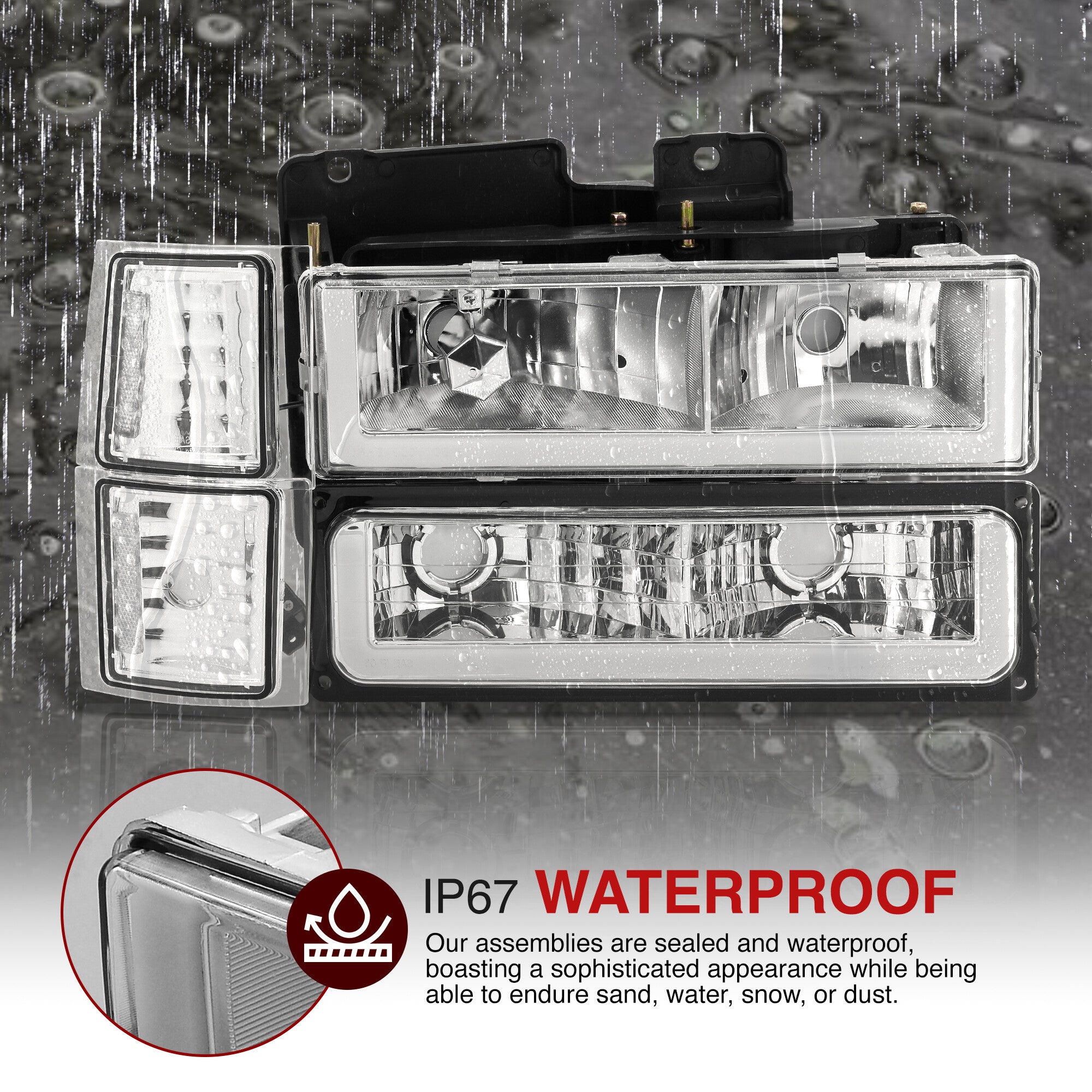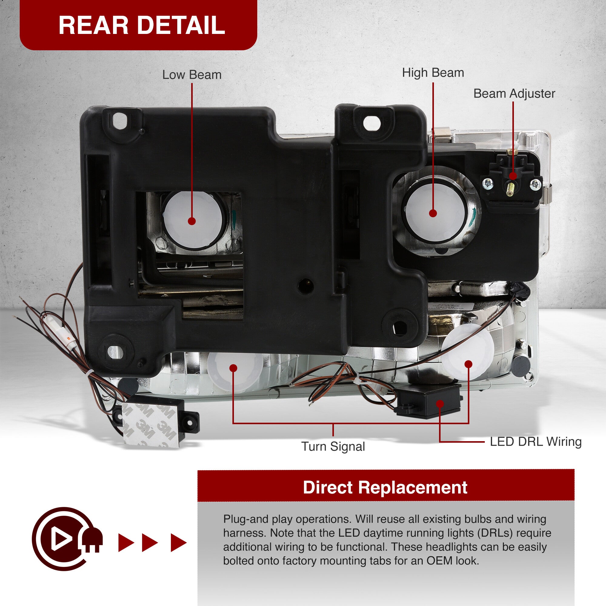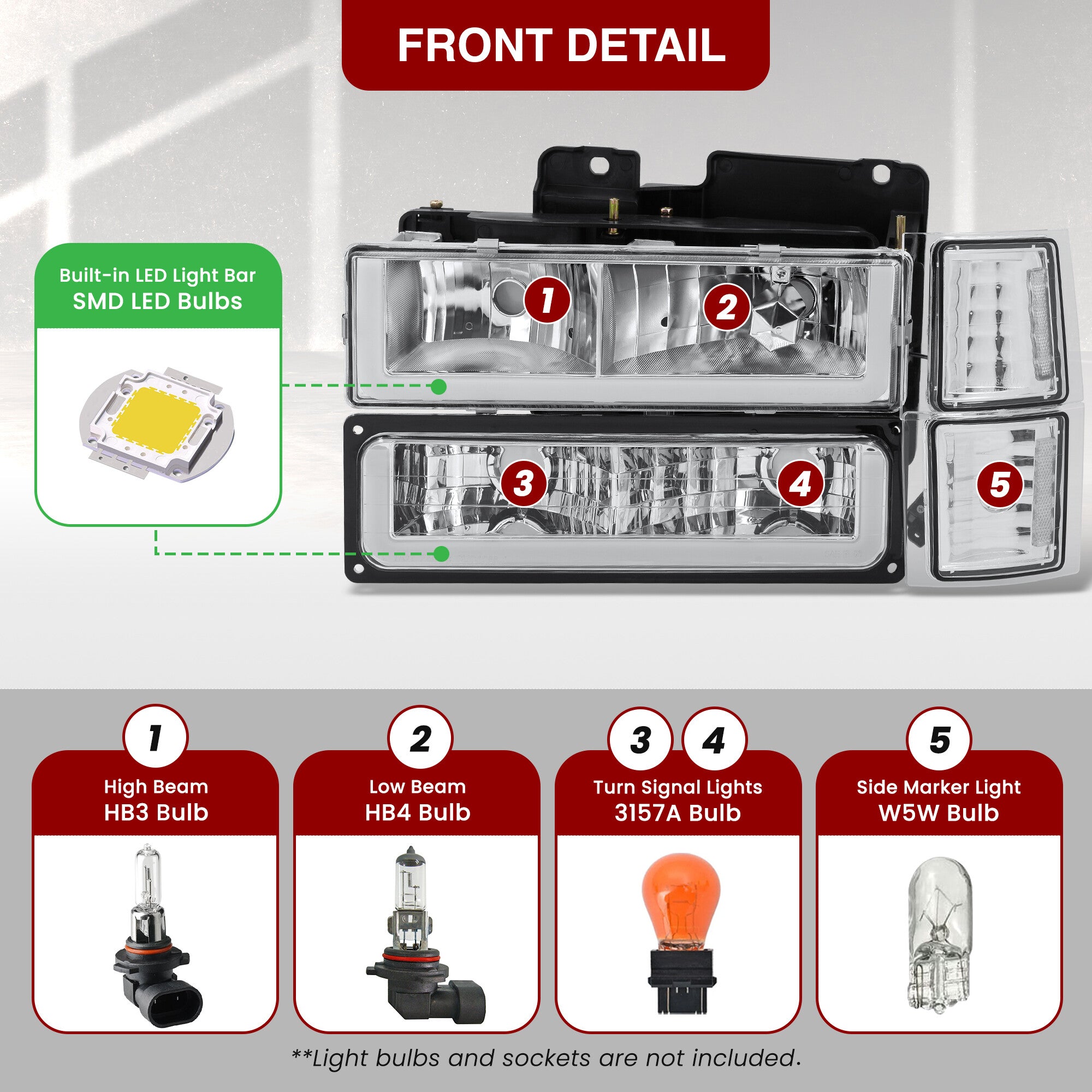 Chevrolet C/K 1500 2500 3500 1994-1998 LED DRL Bar Factory Style Headlights + Bumpers + Corners Chrome Housing Clear Len Clear Reflector