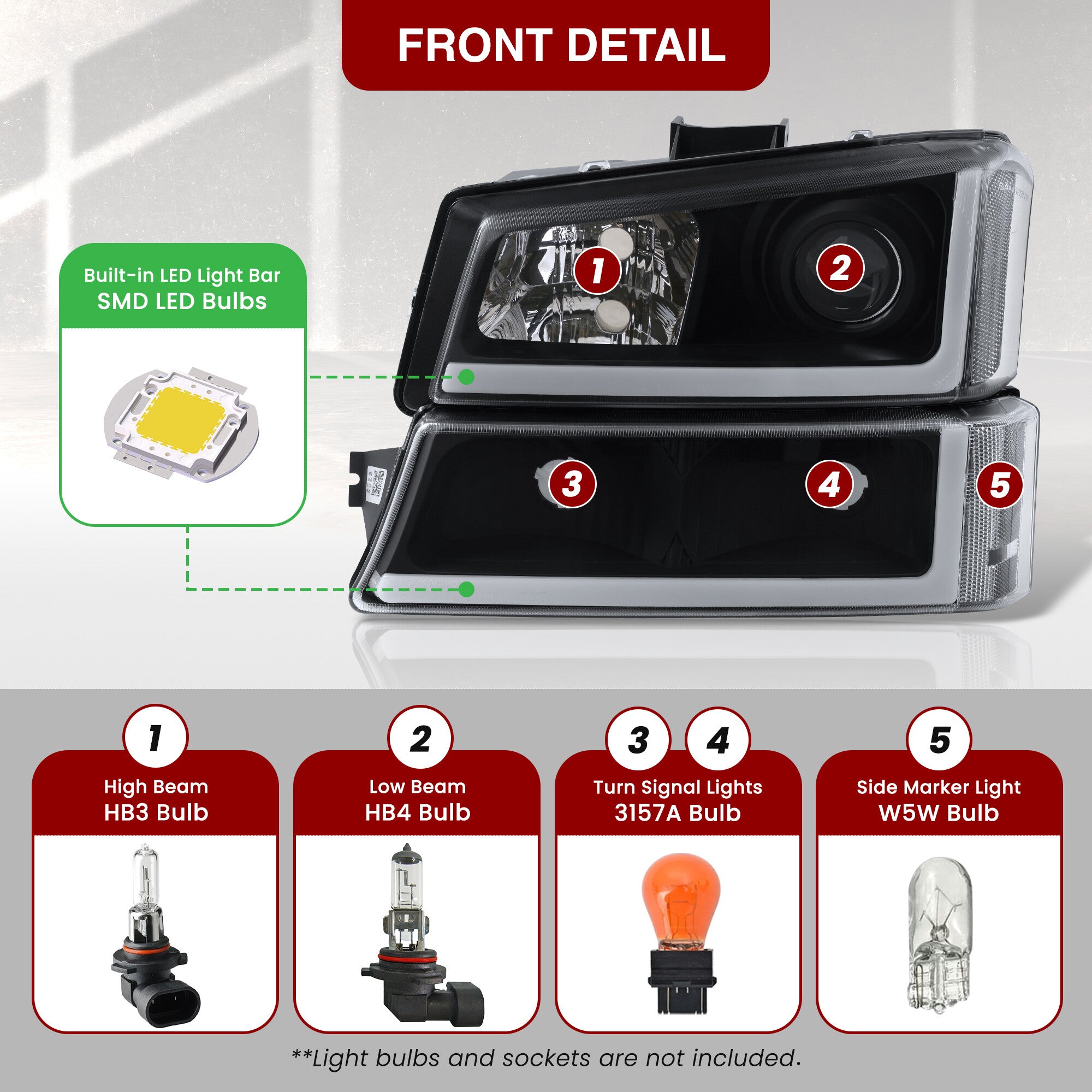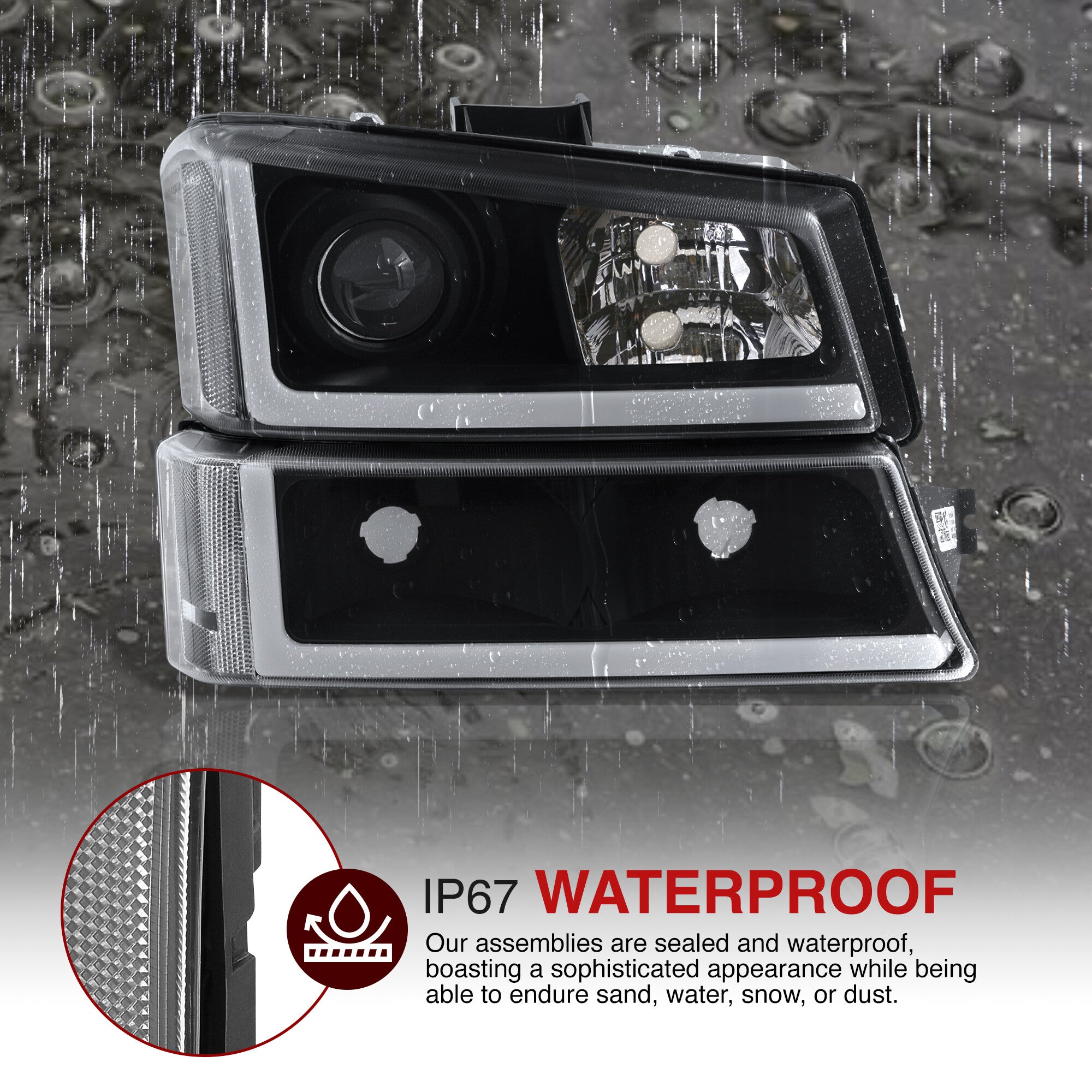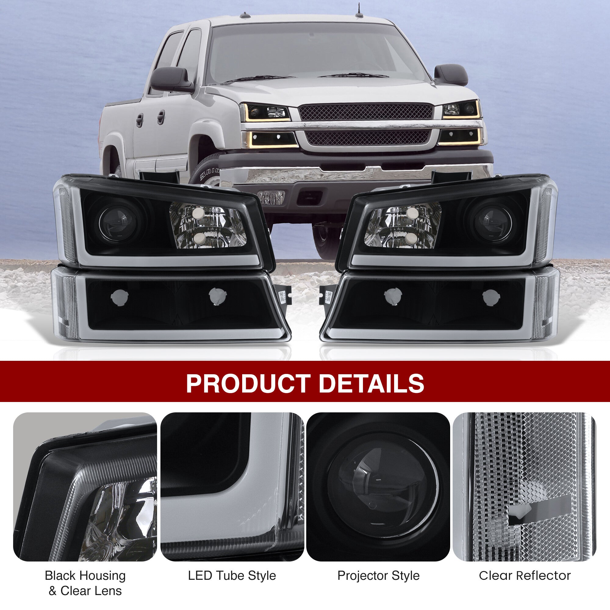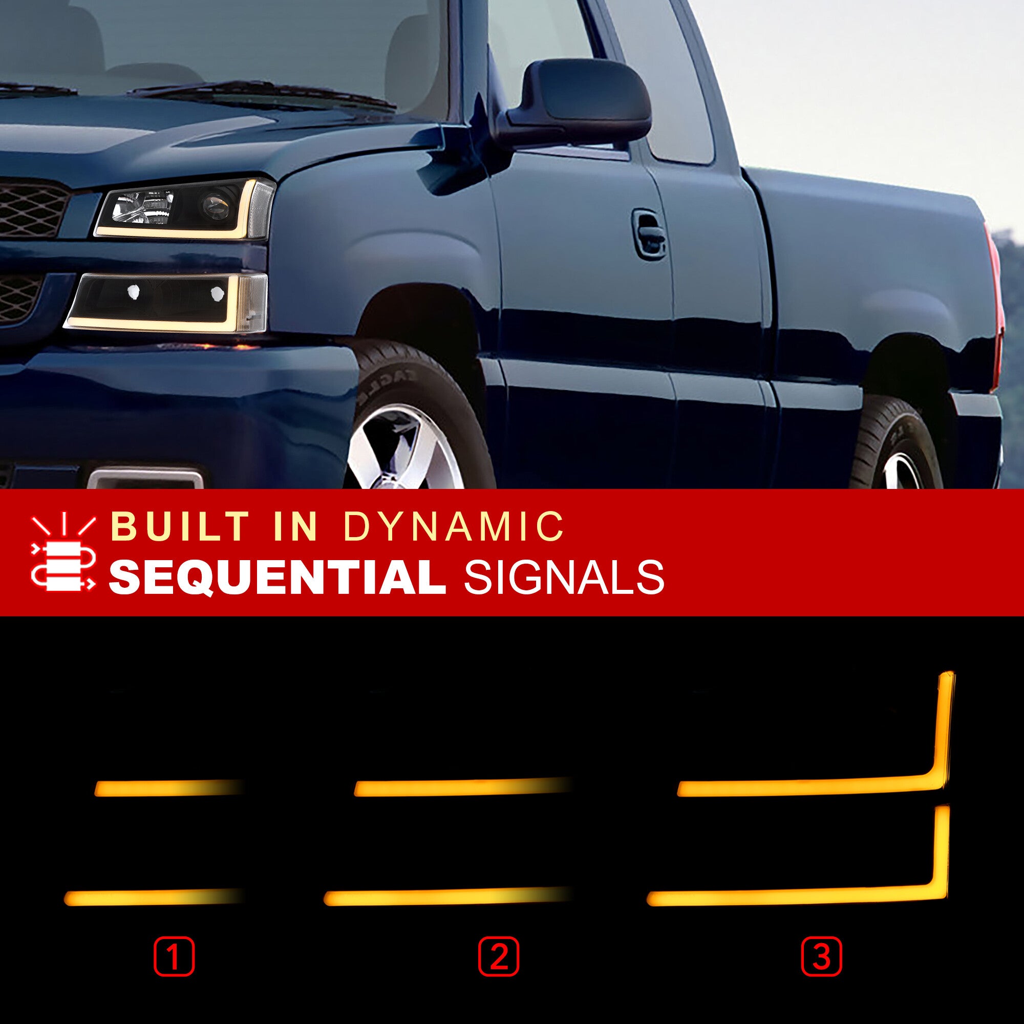 Chevrolet Silverado 2003-2006 Sequential LED DRL Bar Projector Headlights + Bumpers Black Housing Clear Len Clear Reflector
