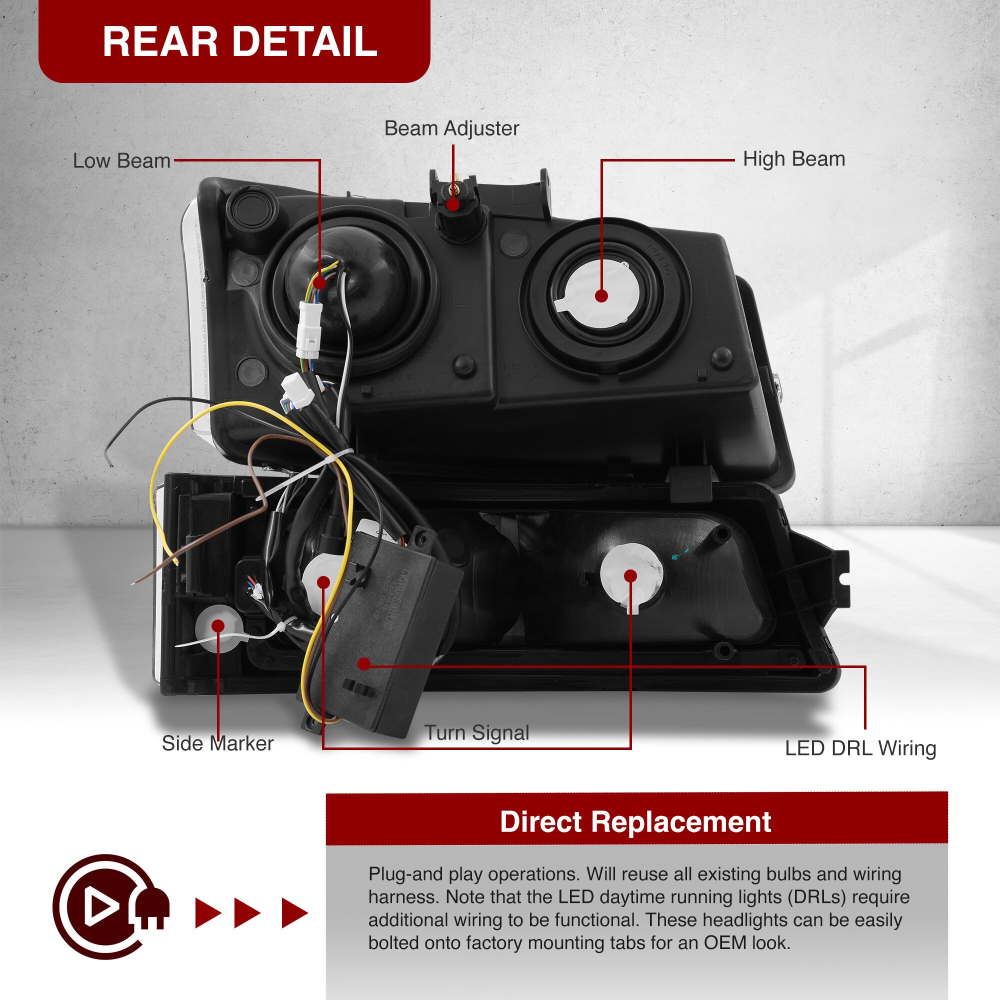 • Direct replacement projector headlights with sequential LED DRL signals + bumper lights.