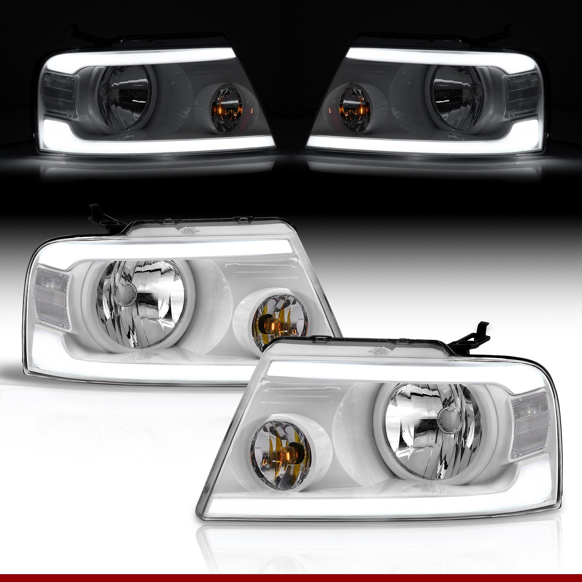 Ford F150 2004-2008 / Lincoln Mark LT 2005-2008 LED DRL Bar Factory Style Headlights White Housing Clear Len Clear Reflector