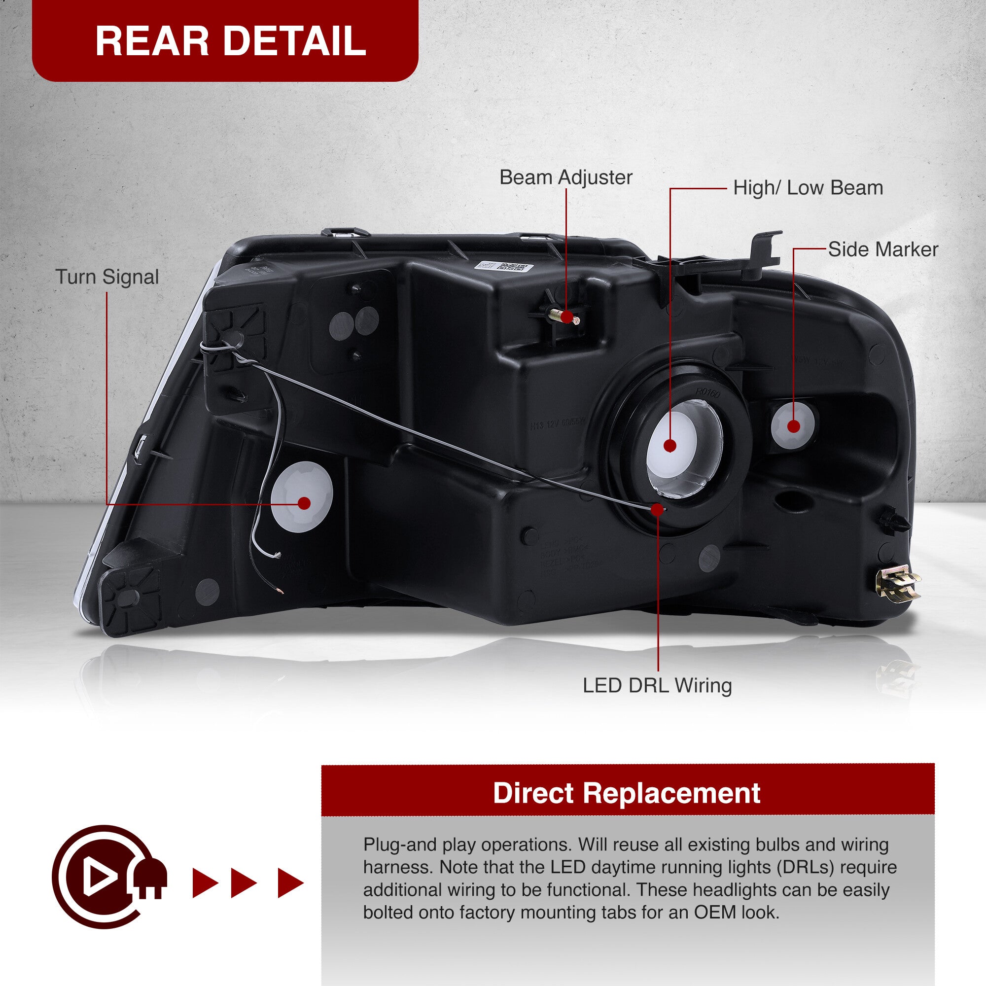 • Direct replacement factory style headlights with LED DRL tubes.