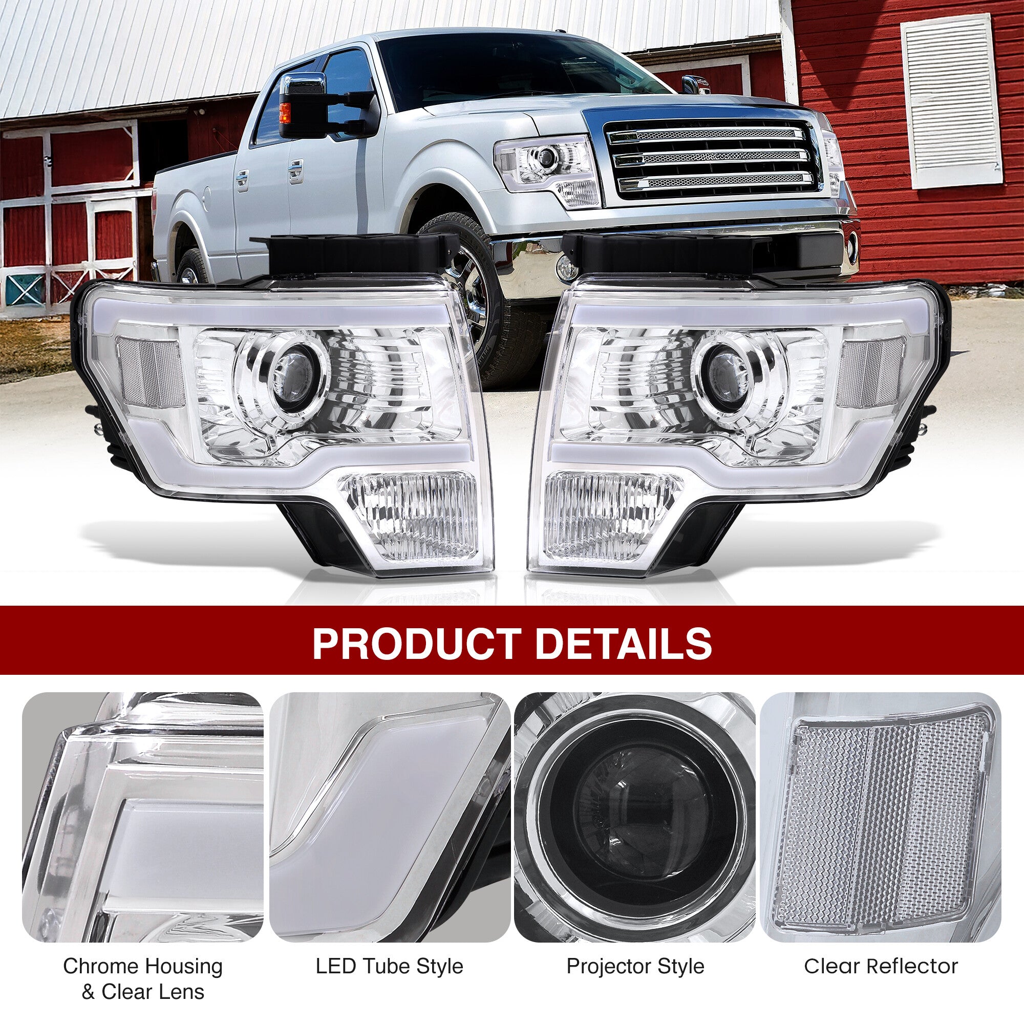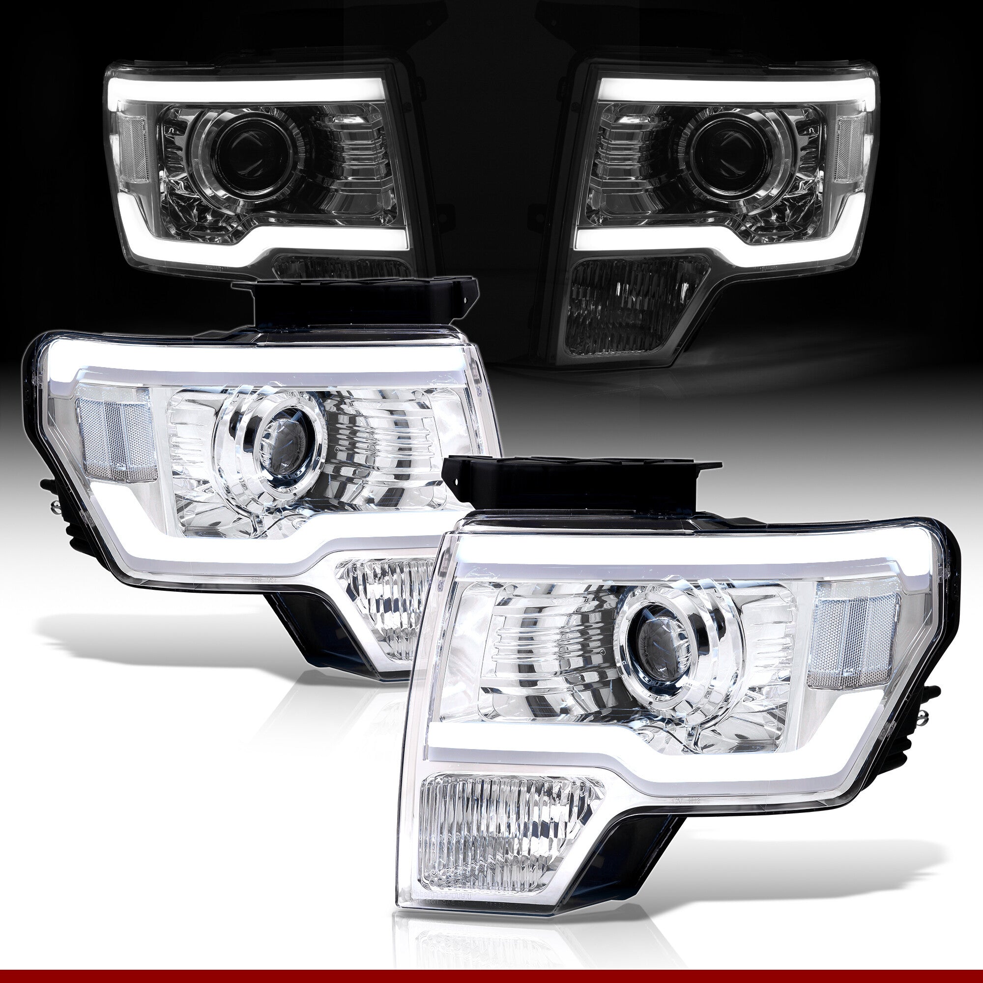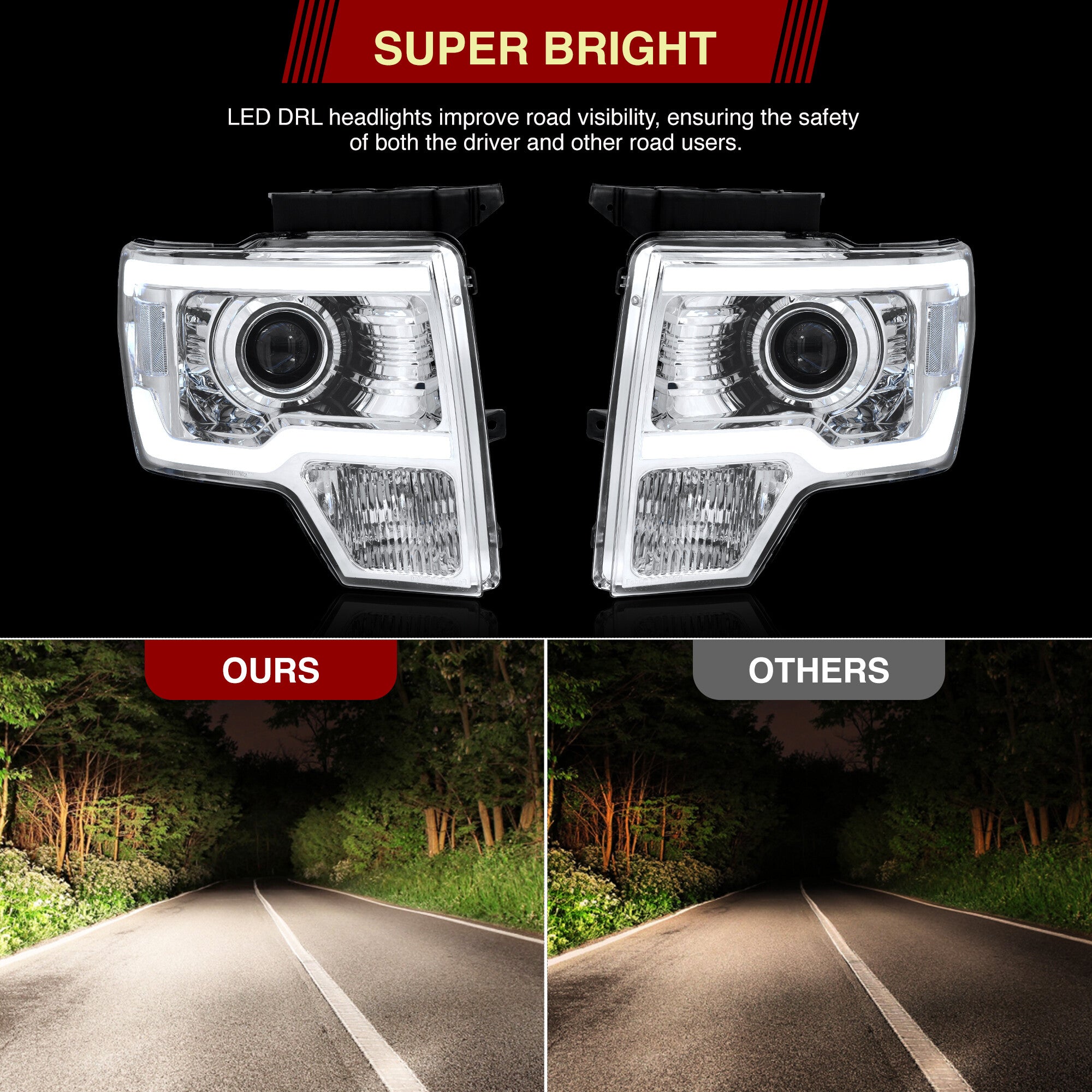 Ford F150 2009-2014 LED DRL Bar Projector Headlights Chrome Housing Clear Len Clear Reflector (Halogen Models Only)