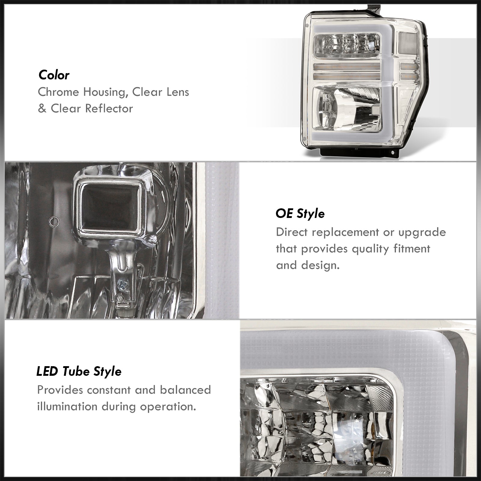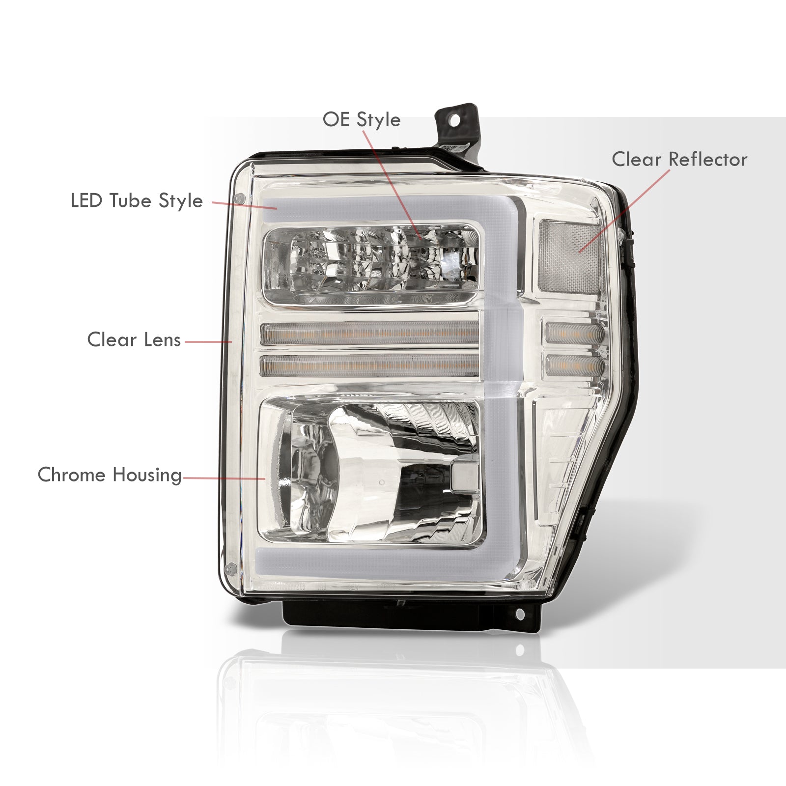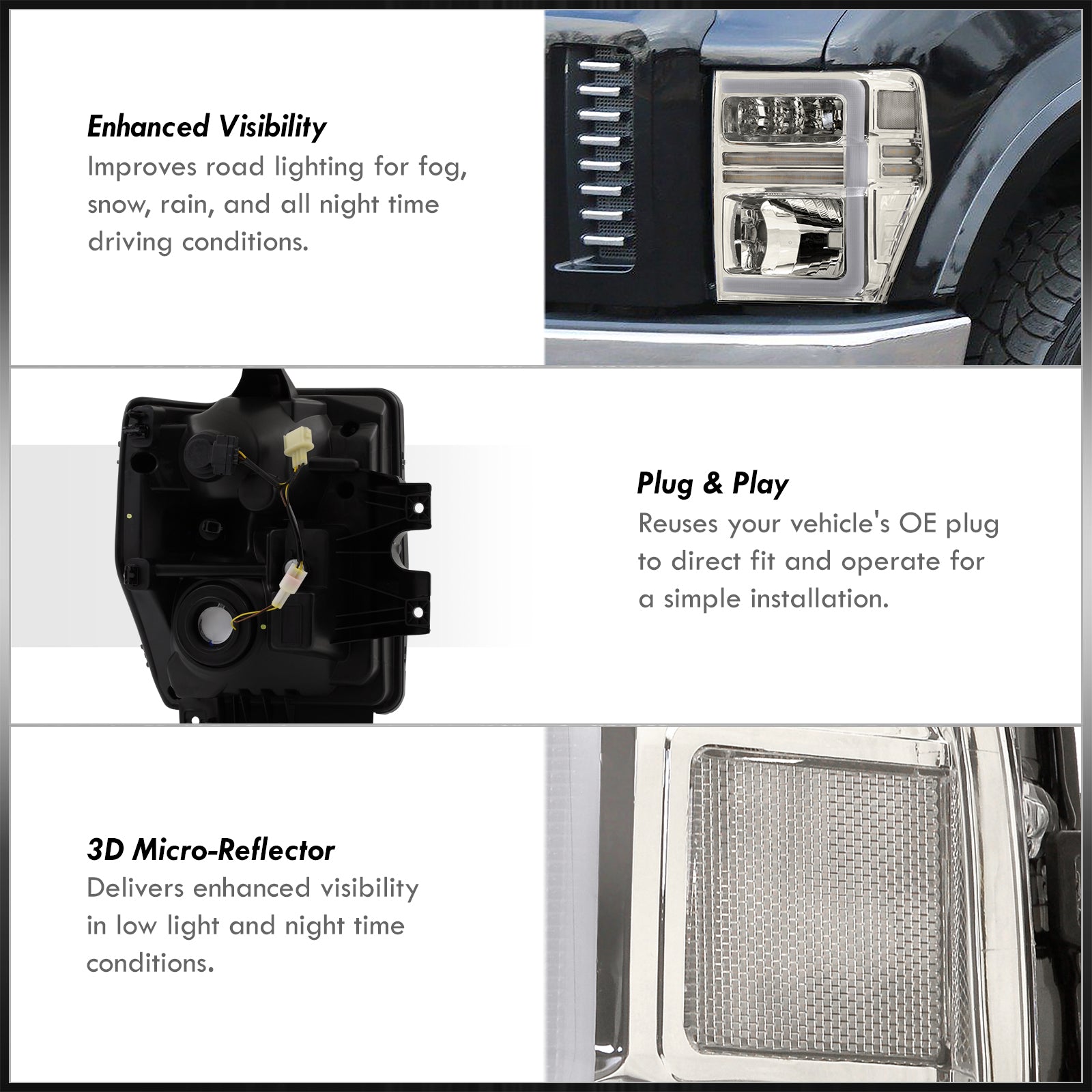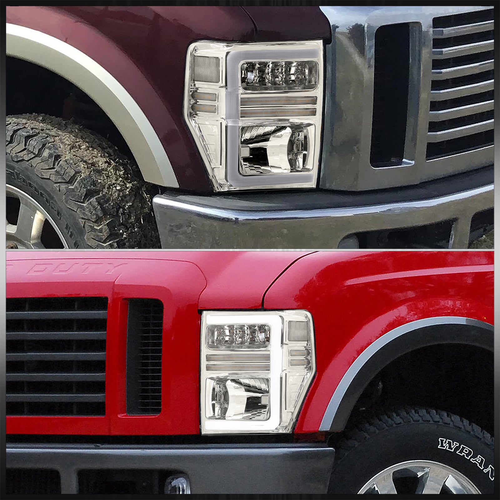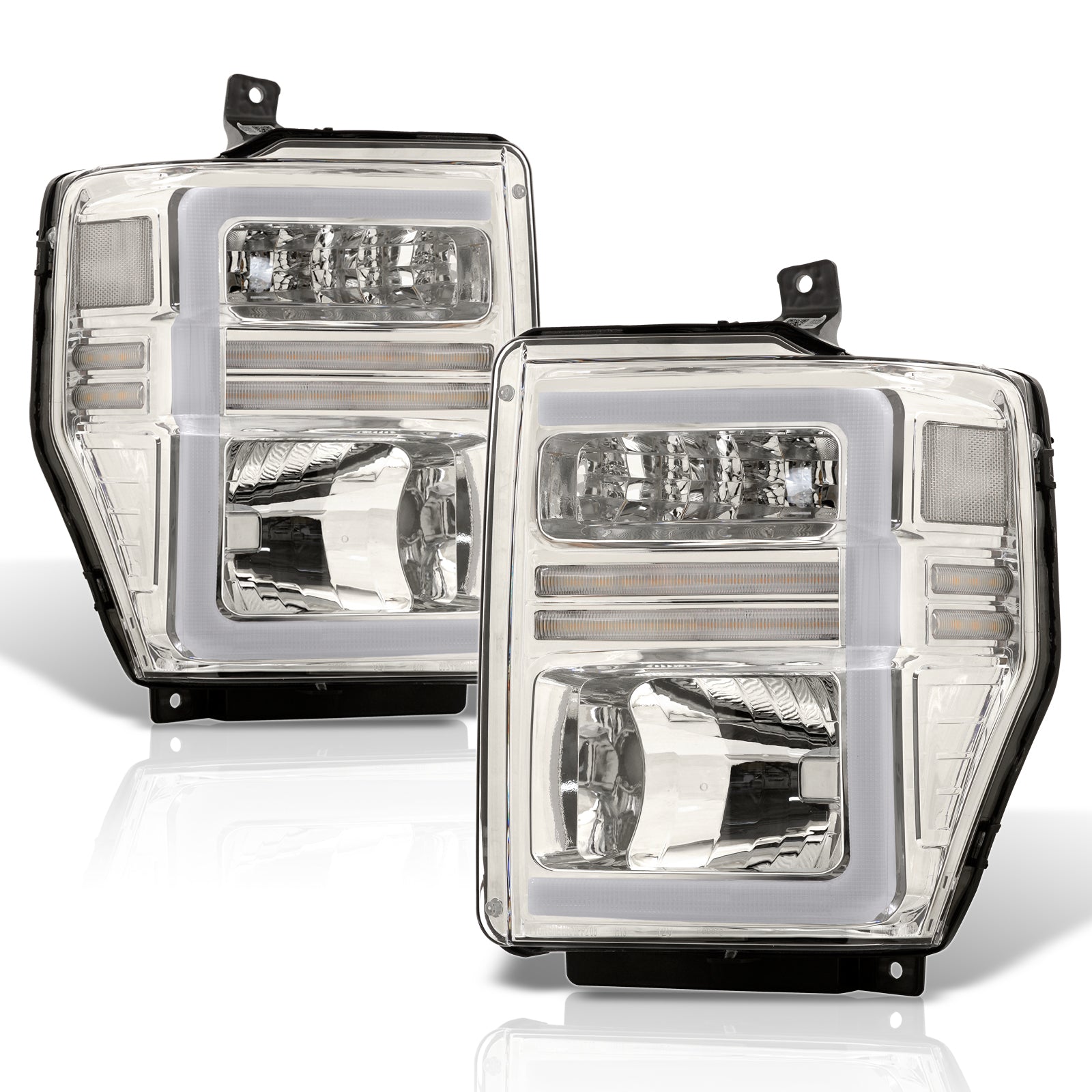 Ford F250 F350 F450 F550 Super Duty 2008-2010 Sequential LED DRL Bar Factory Style Headlights Chrome Housing Clear Len Clear Reflector