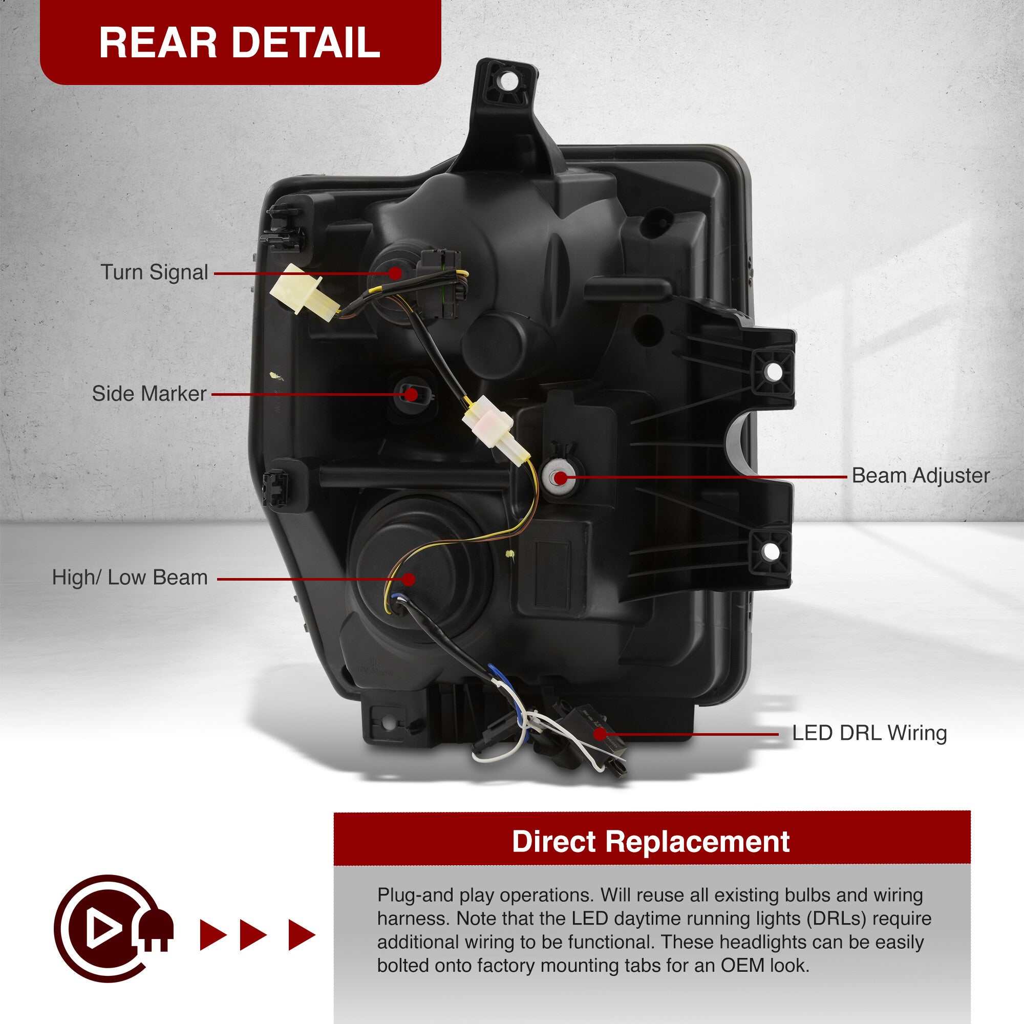 - Simple plug and play operations; no modifications required. Reuses factory mounting tabs for a 100% OEM look.