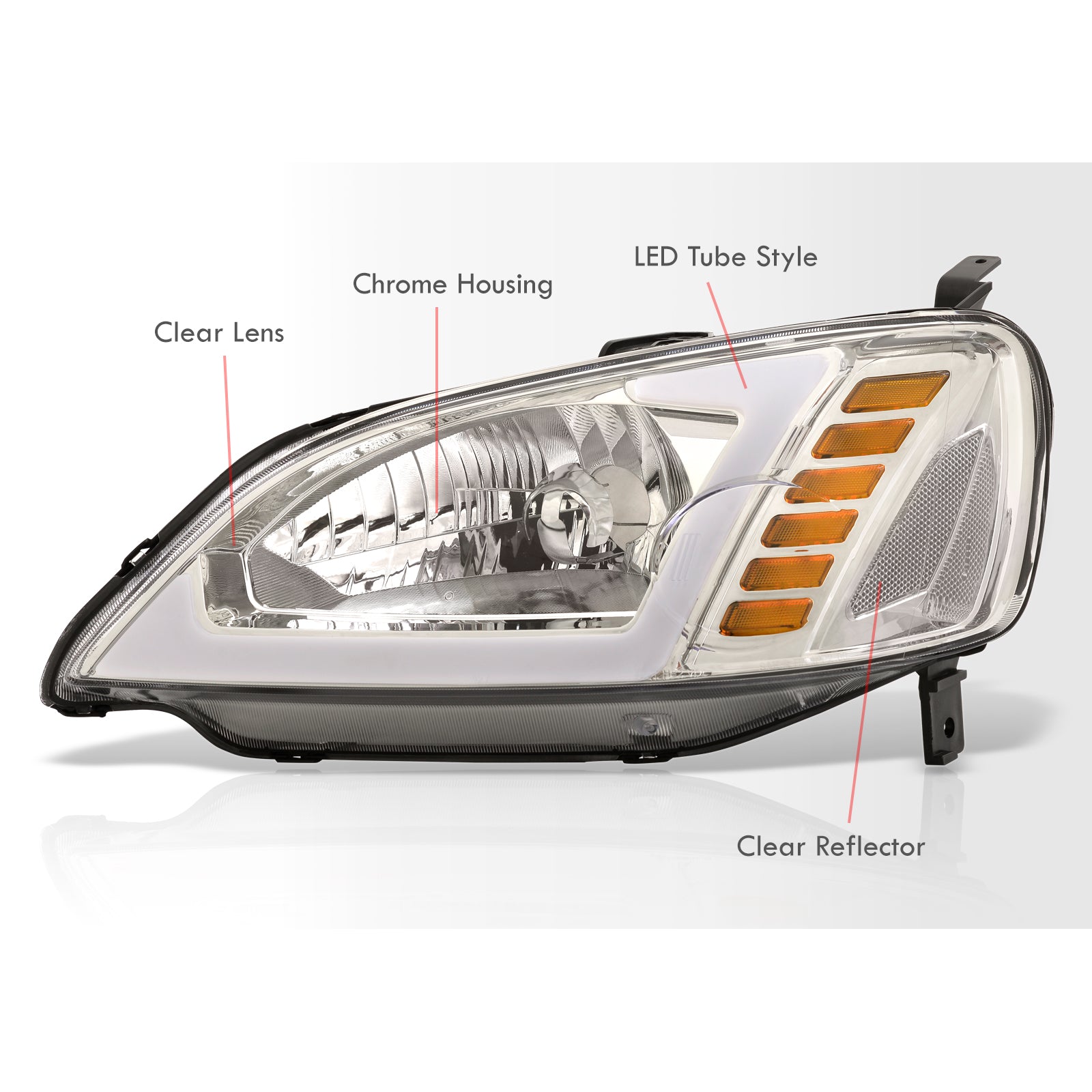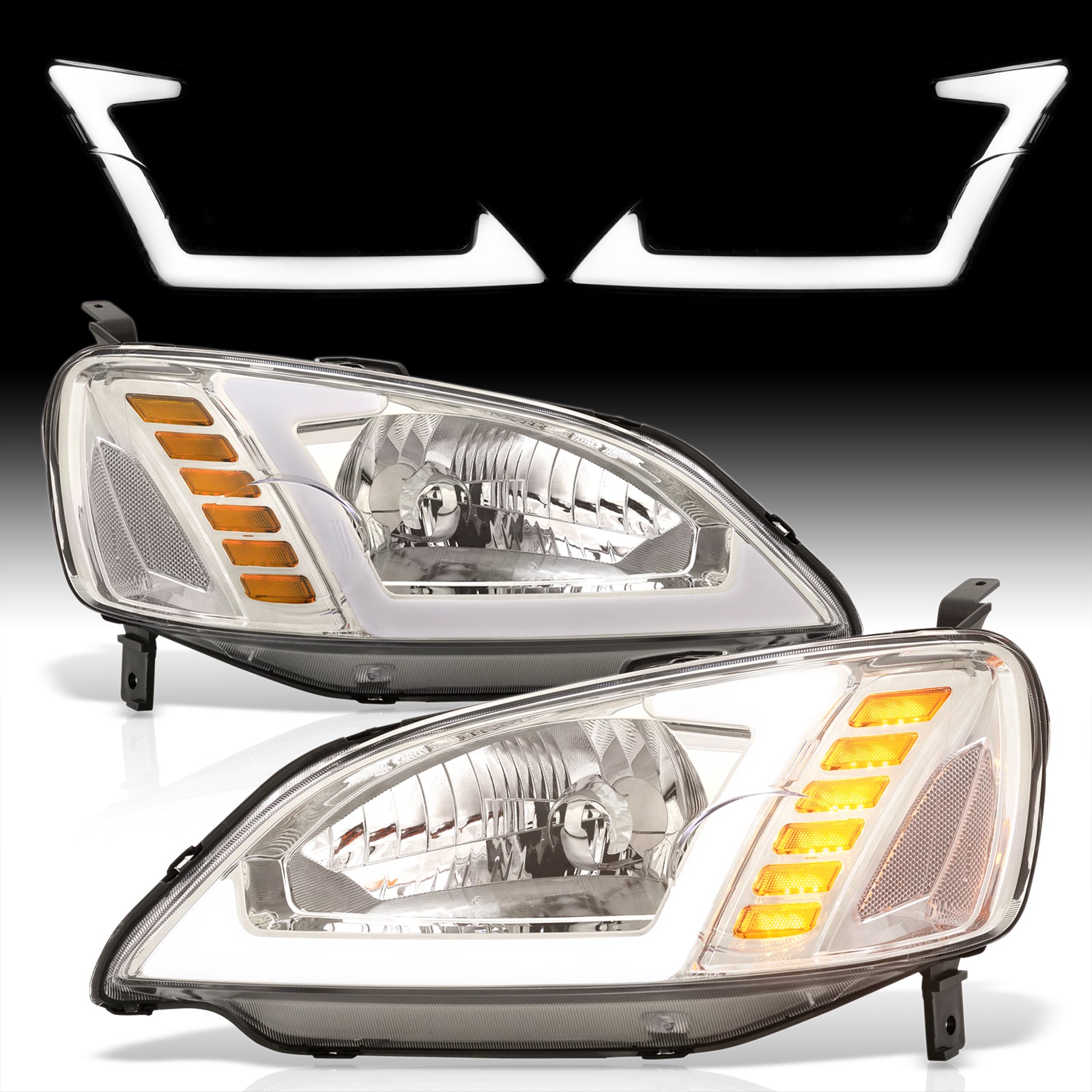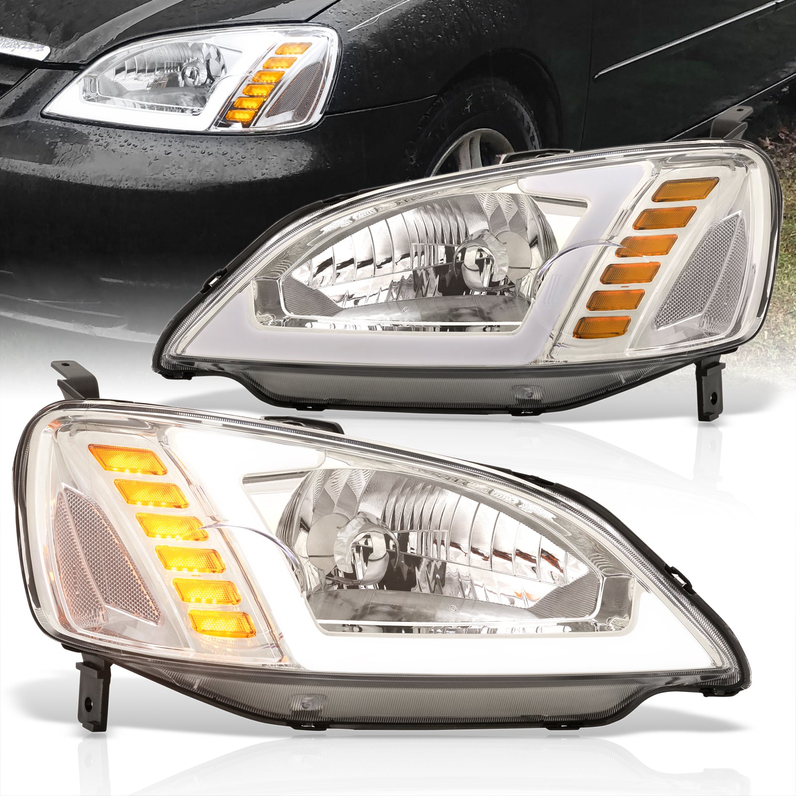 Honda Civic 2001-2003 Sequential LED DRL Bar Factory Style Headlights Chrome Housing Clear Len Clear Reflector