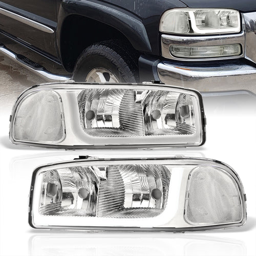 GMC Sierra 1500 2500 1999-2007 / Sierra 1500HD 2500HD 3500 2001-2007 / Yukon 1999-2006 / Yukon XL 1500 2500 2000-2006 LED DRL Bar Factory Style Headlights Chrome Housing Clear Len Clear Reflector