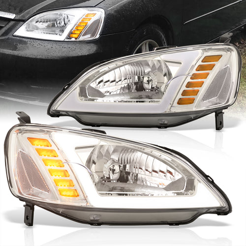 Honda Civic 2001-2003 Sequential LED DRL Bar Factory Style Headlights Chrome Housing Clear Len Clear Reflector