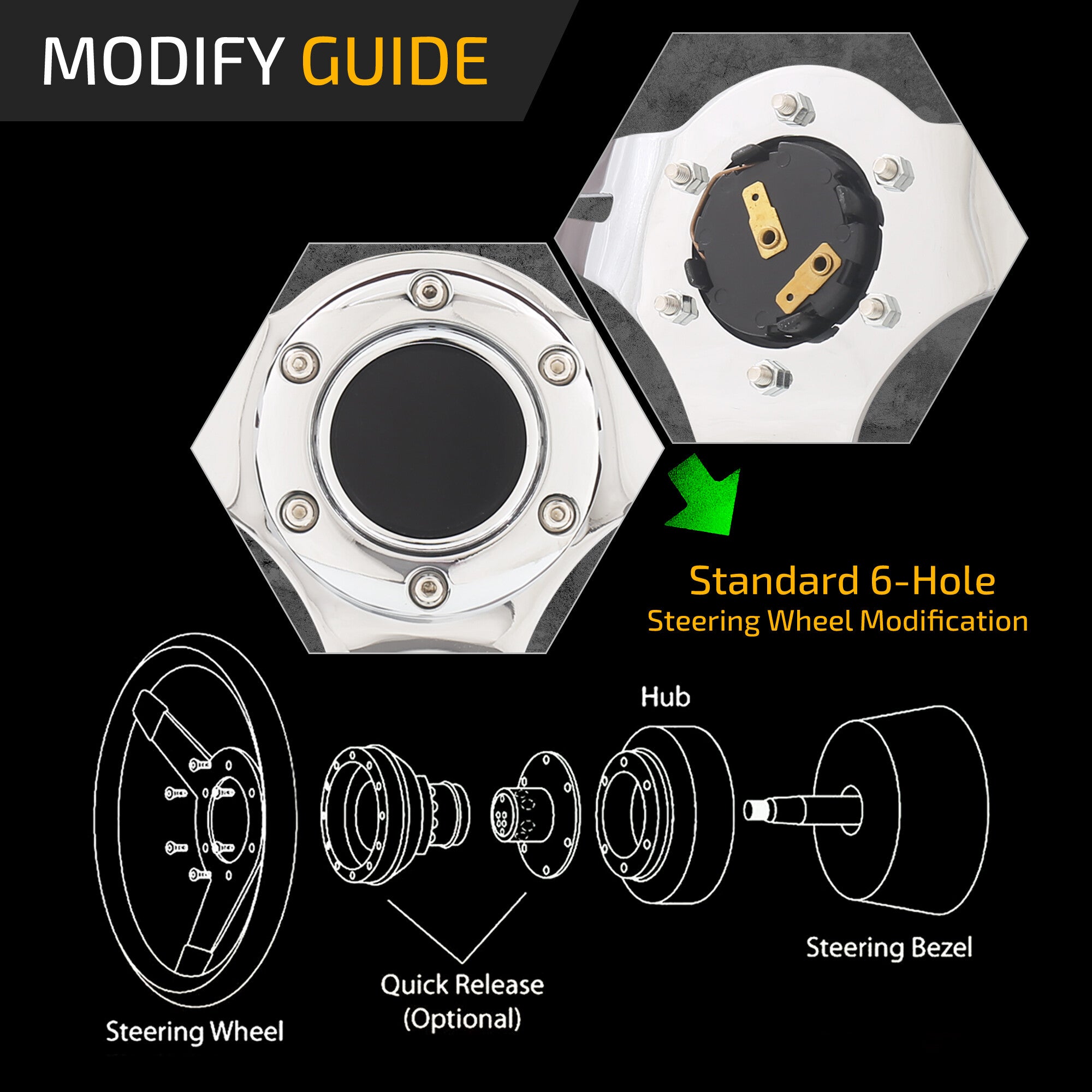 • Fits any aftermarket 6 bolt pattern steering wheel and hub adapter (not included).