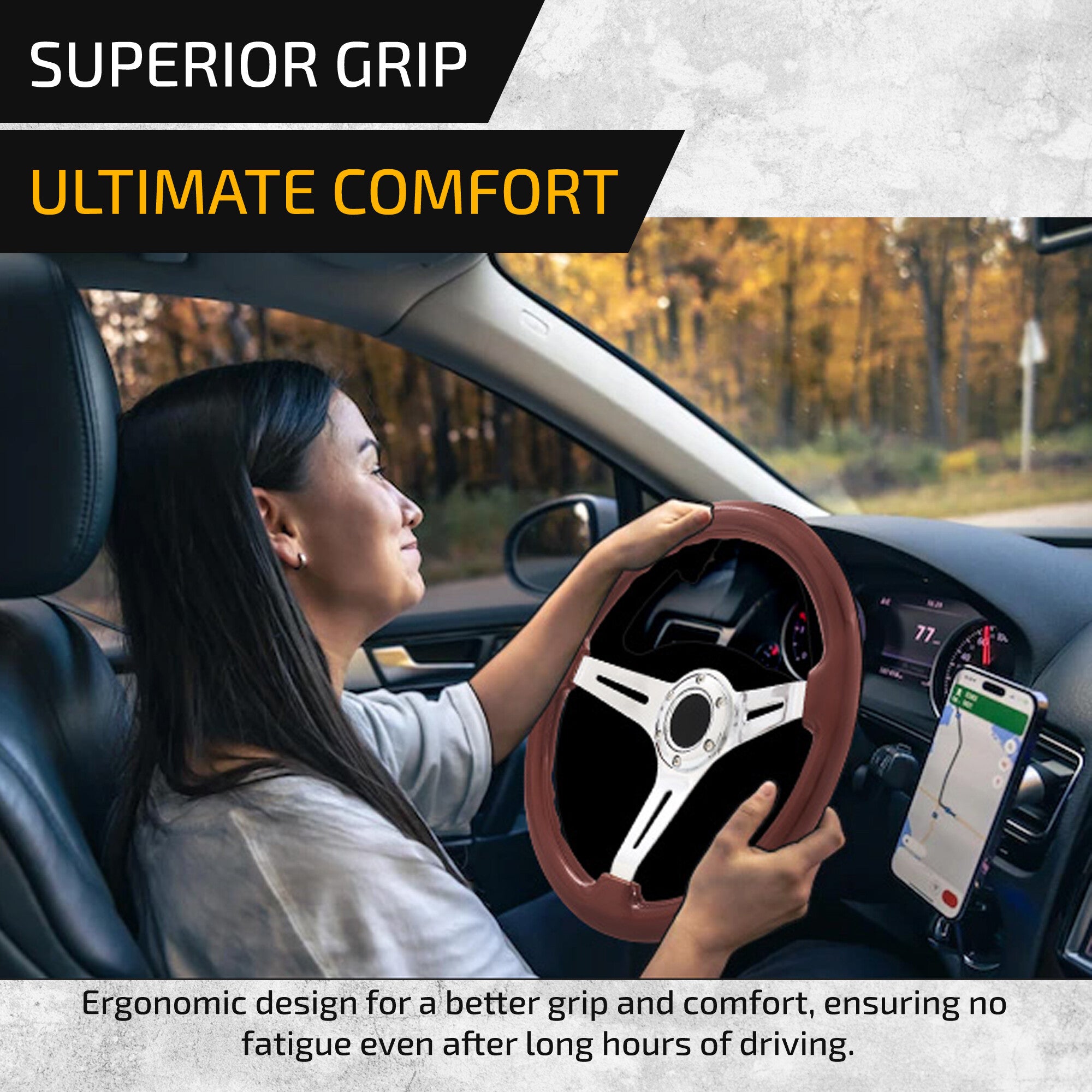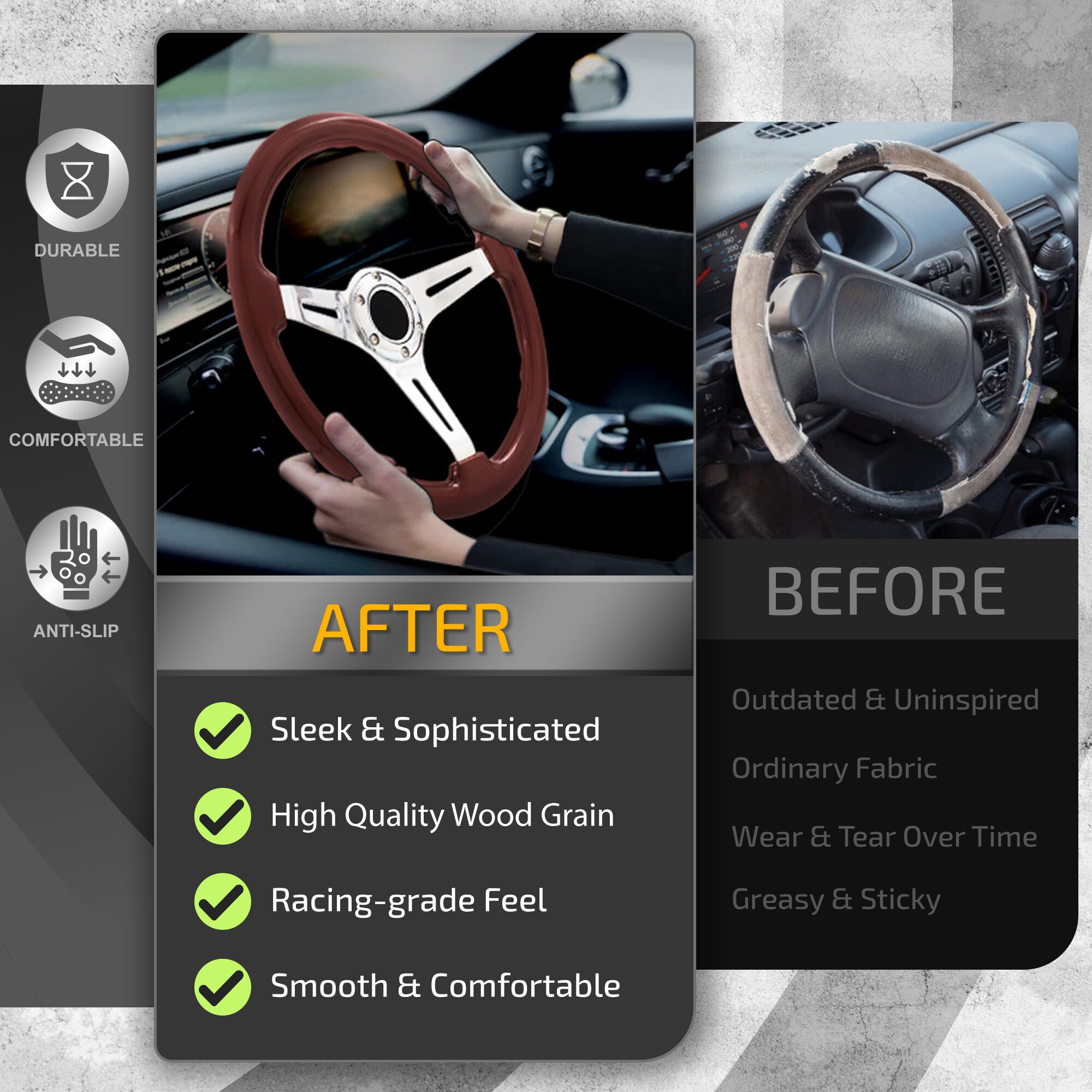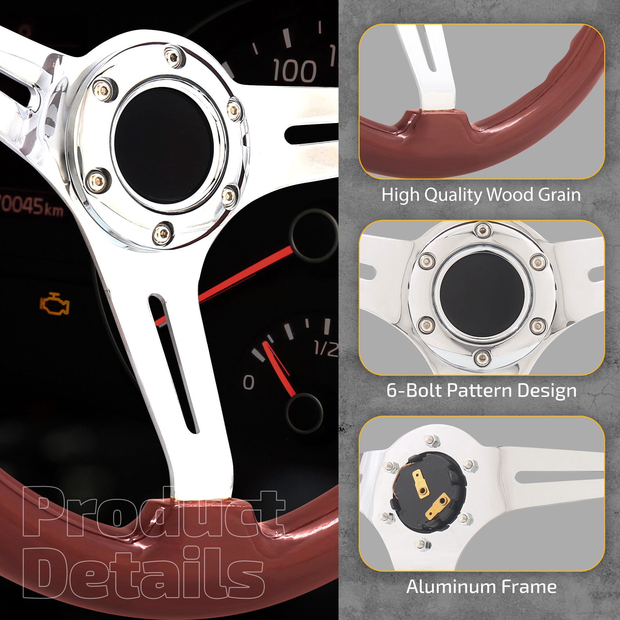 • Universal 350mm wood grain style steering wheel with horn button.