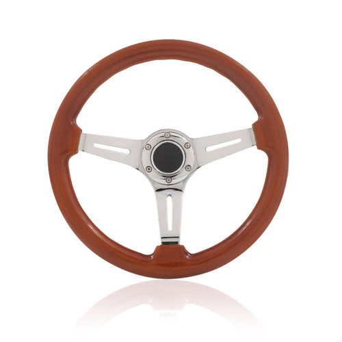 Universal 350mm Heavy Duty Steel Wood Grain Style Steering Wheel Polished Center Dark Wood