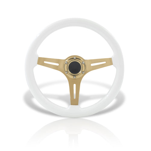 Universal 350mm Heavy Duty Steel Wood Grain Style Steering Wheel Gold Center White Wood