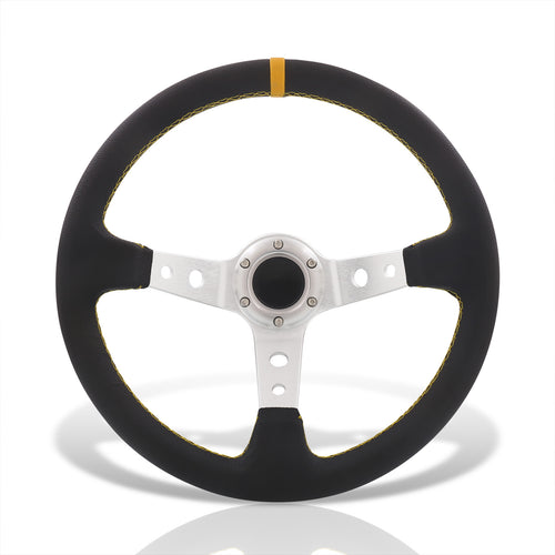 Universal 350mm PVC Leather Deep Dish Style Aluminum Steering Wheel Silver Center with Yellow Stitching