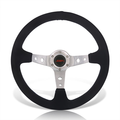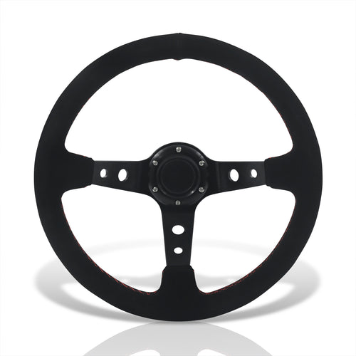 Universal 350mm Suede Deep Dish Style Aluminum Steering Wheel Black with Red Stitching