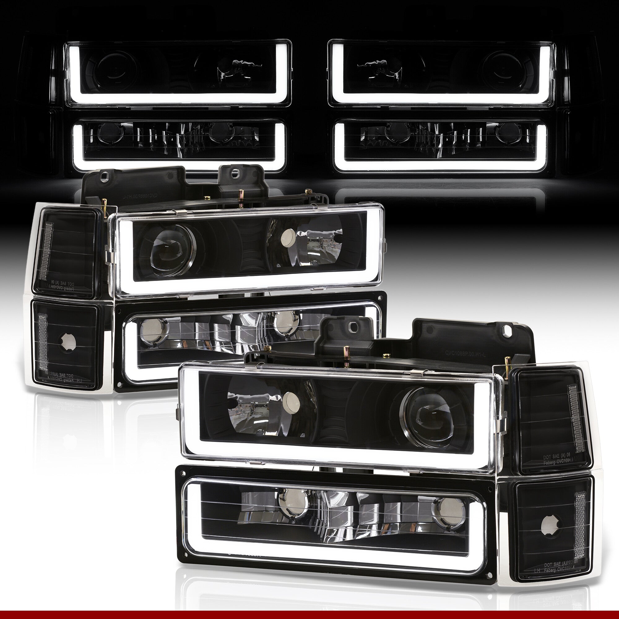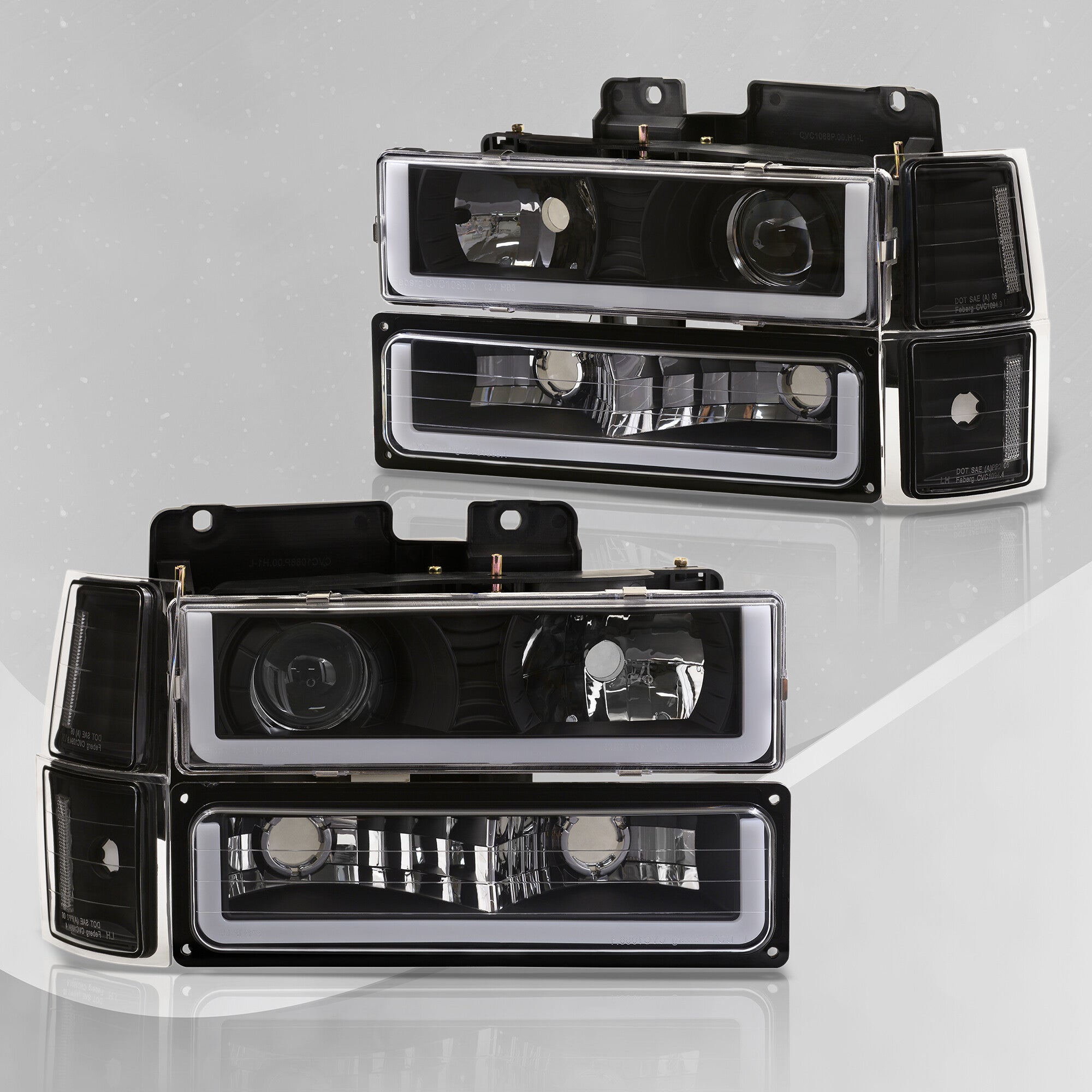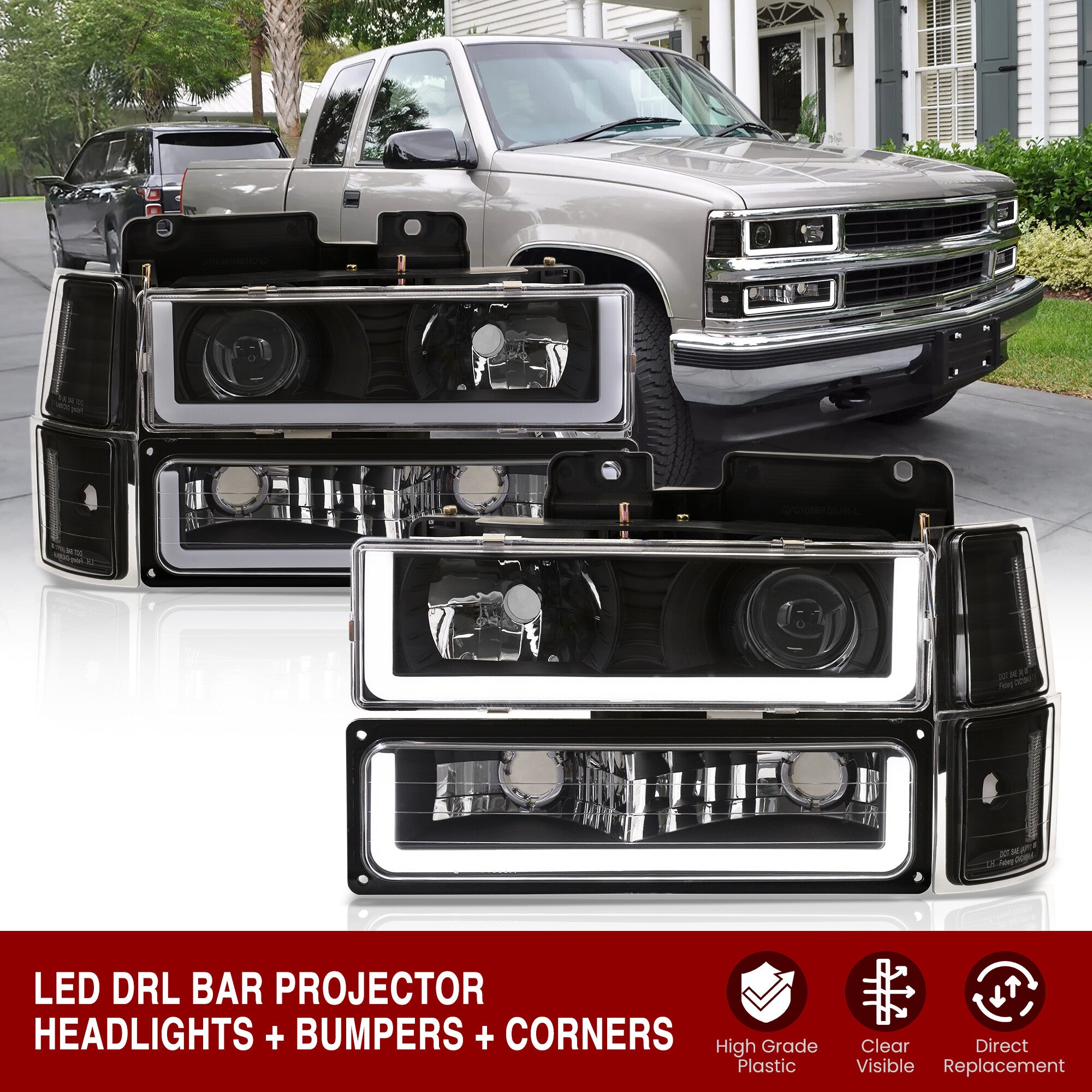 Chevrolet C/K 1500 2500 3500 1994-1998 LED DRL Bar Projector Headlights + Bumpers + Corners Black Housing Clear Len Clear Reflector