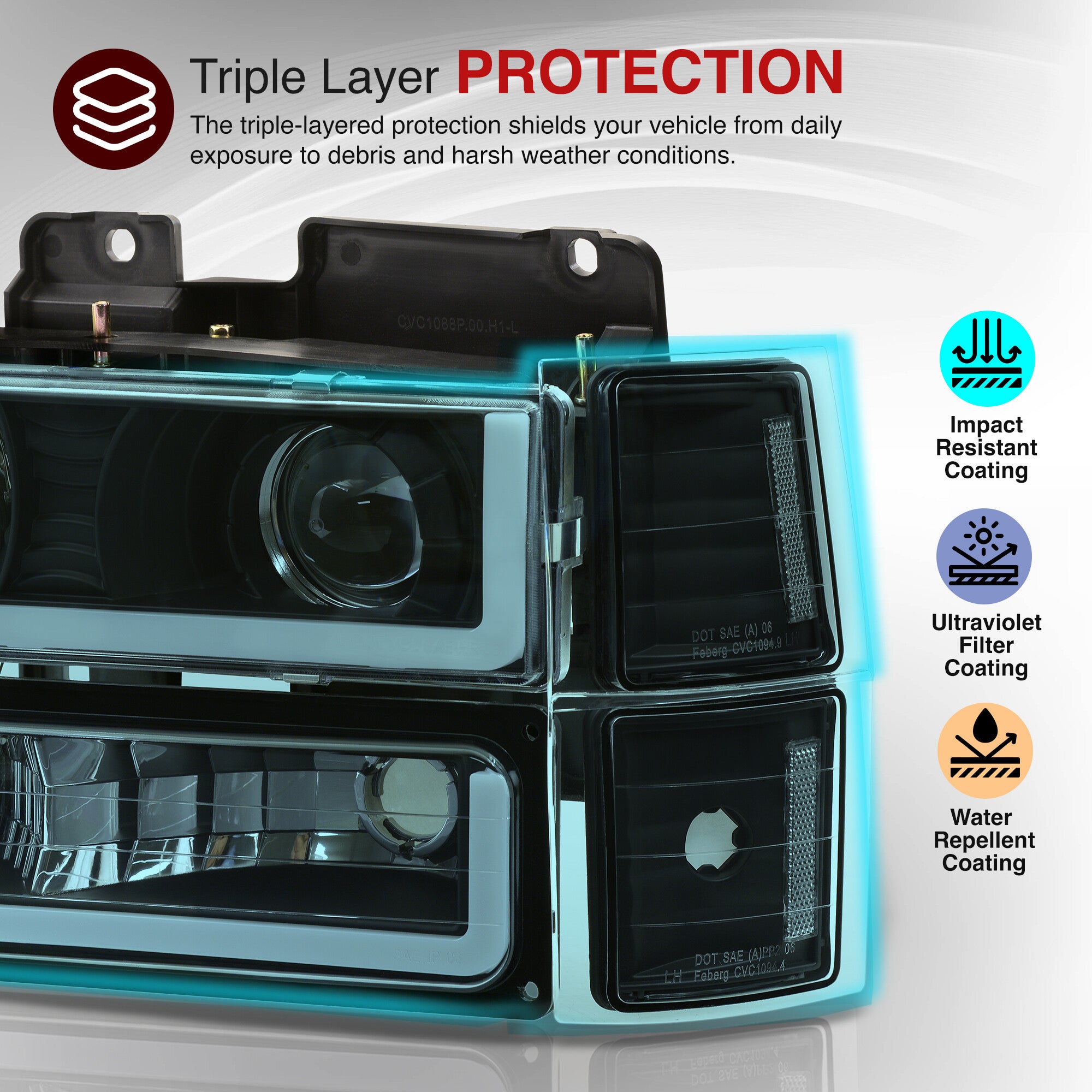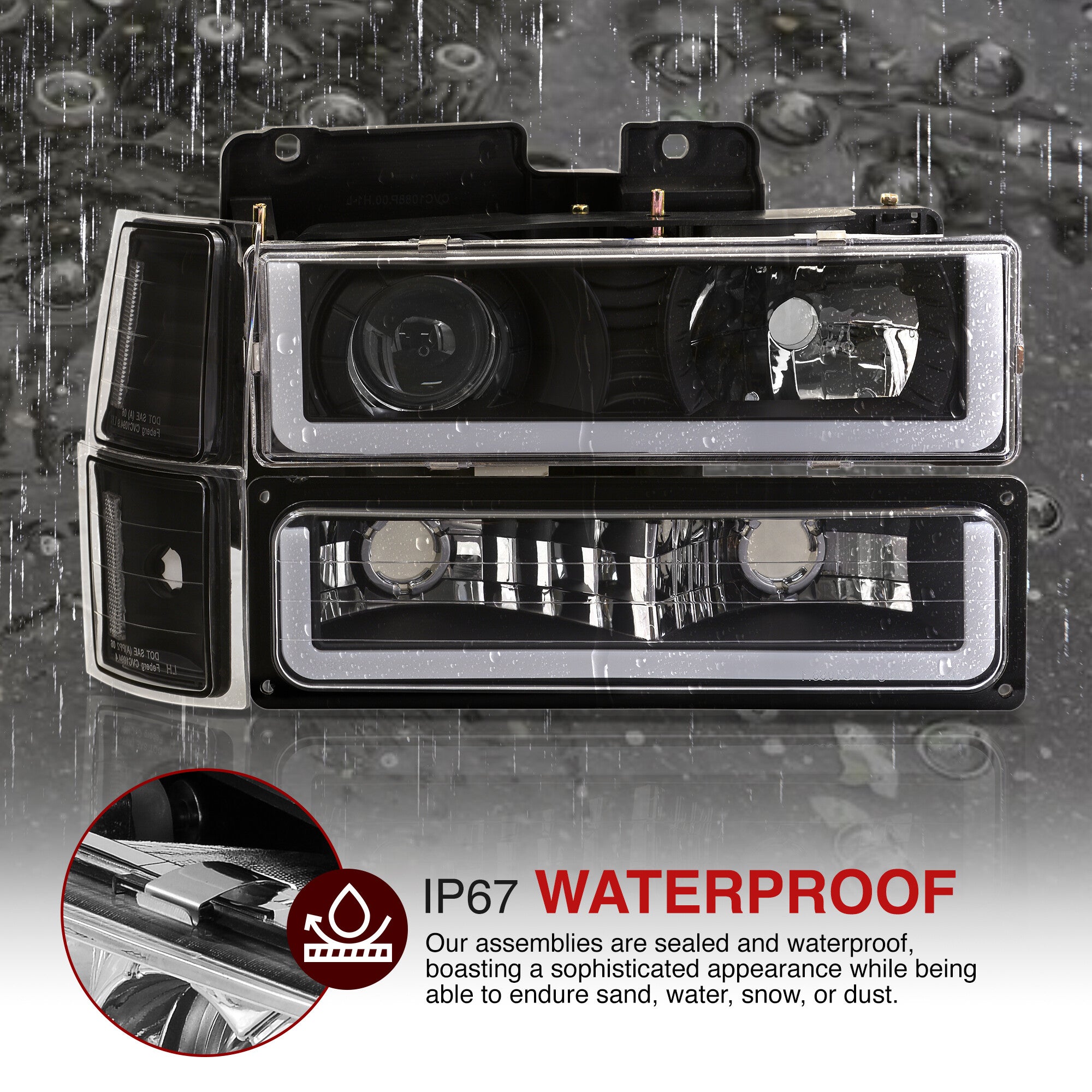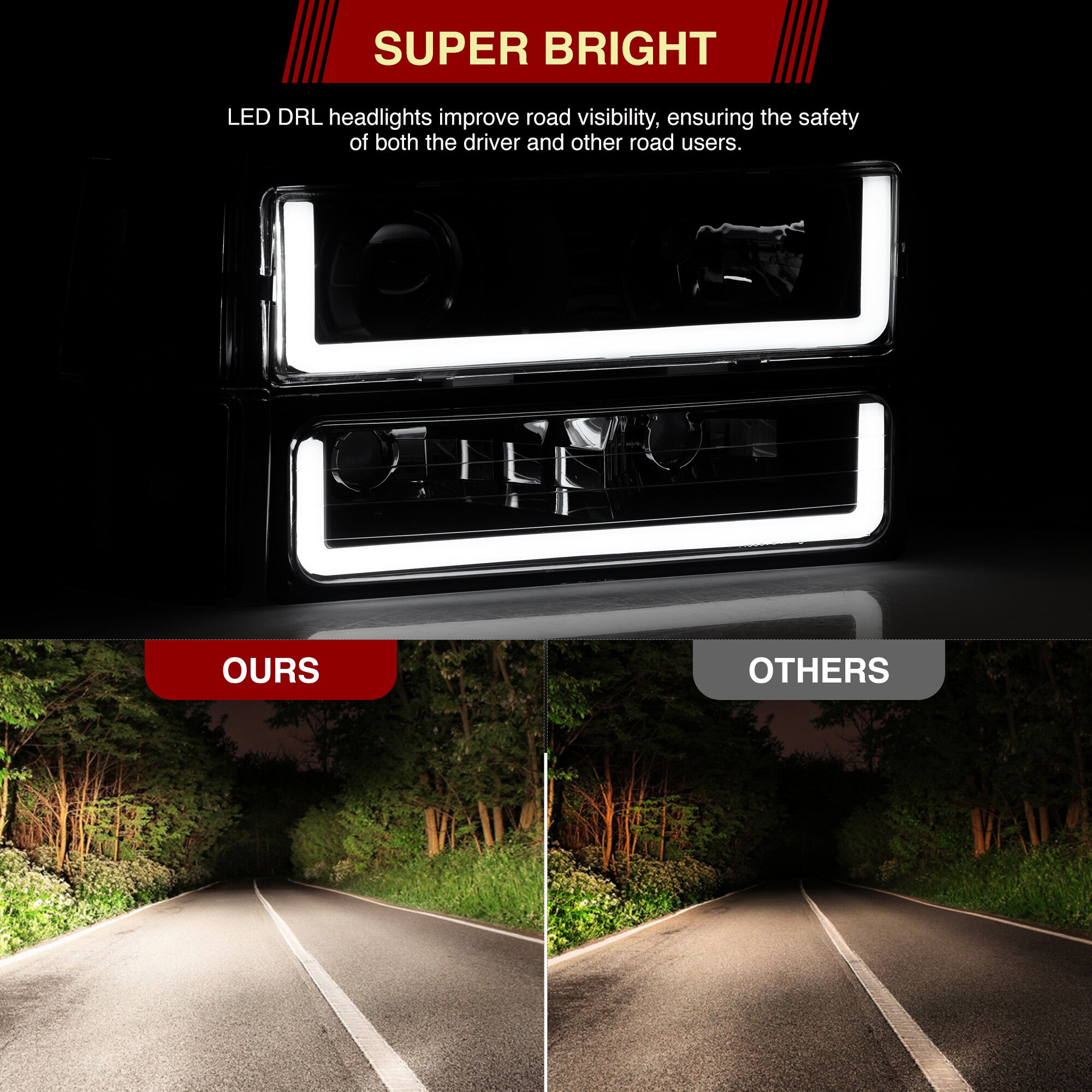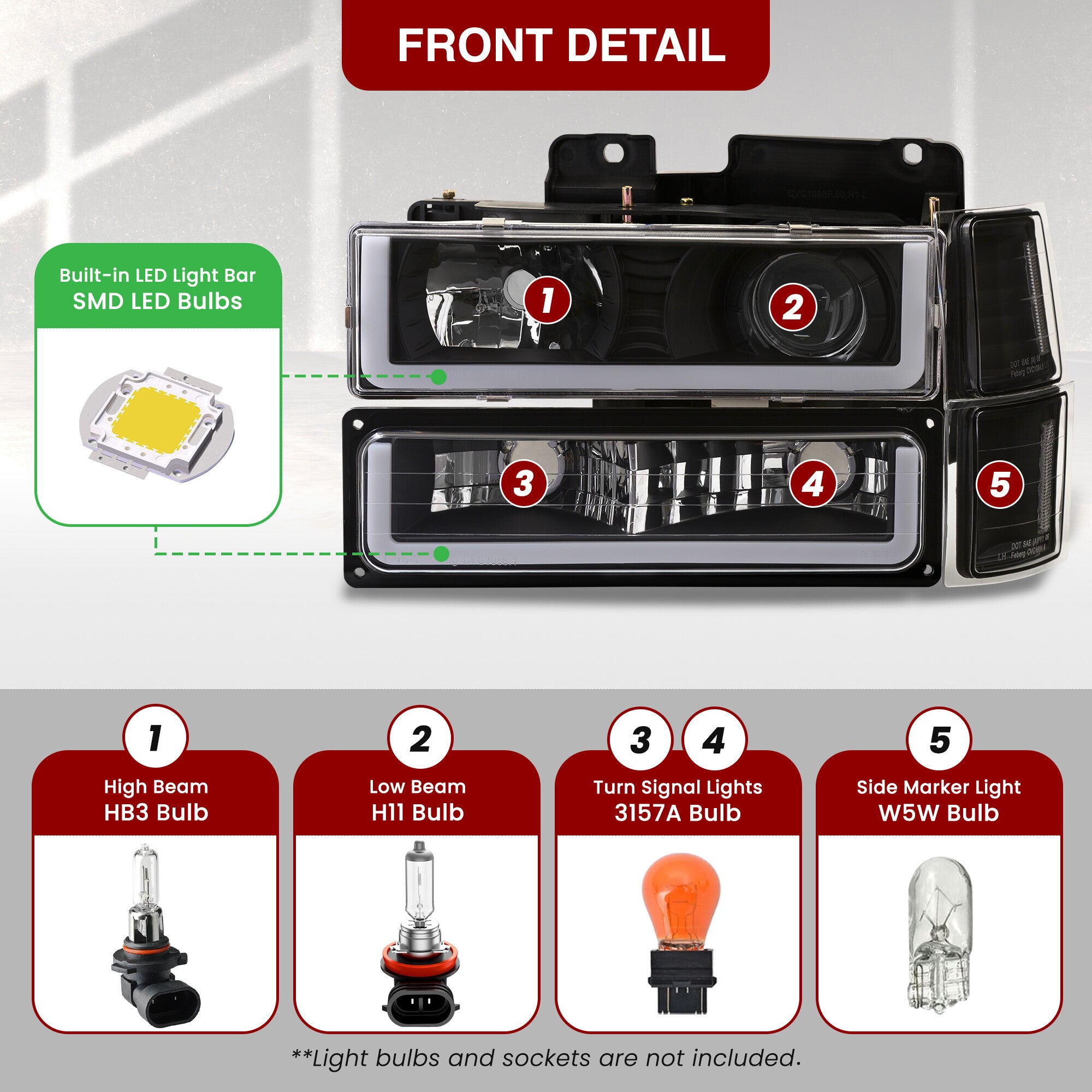 Chevrolet C/K 1500 2500 3500 1994-1998 LED DRL Bar Projector Headlights + Bumpers + Corners Black Housing Clear Len Clear Reflector