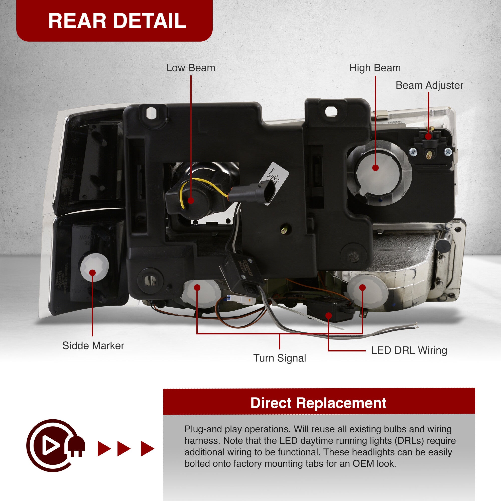 • Replaces old headlights with updated LED DRL projector lights to provide constant and balanced illumination during operation.