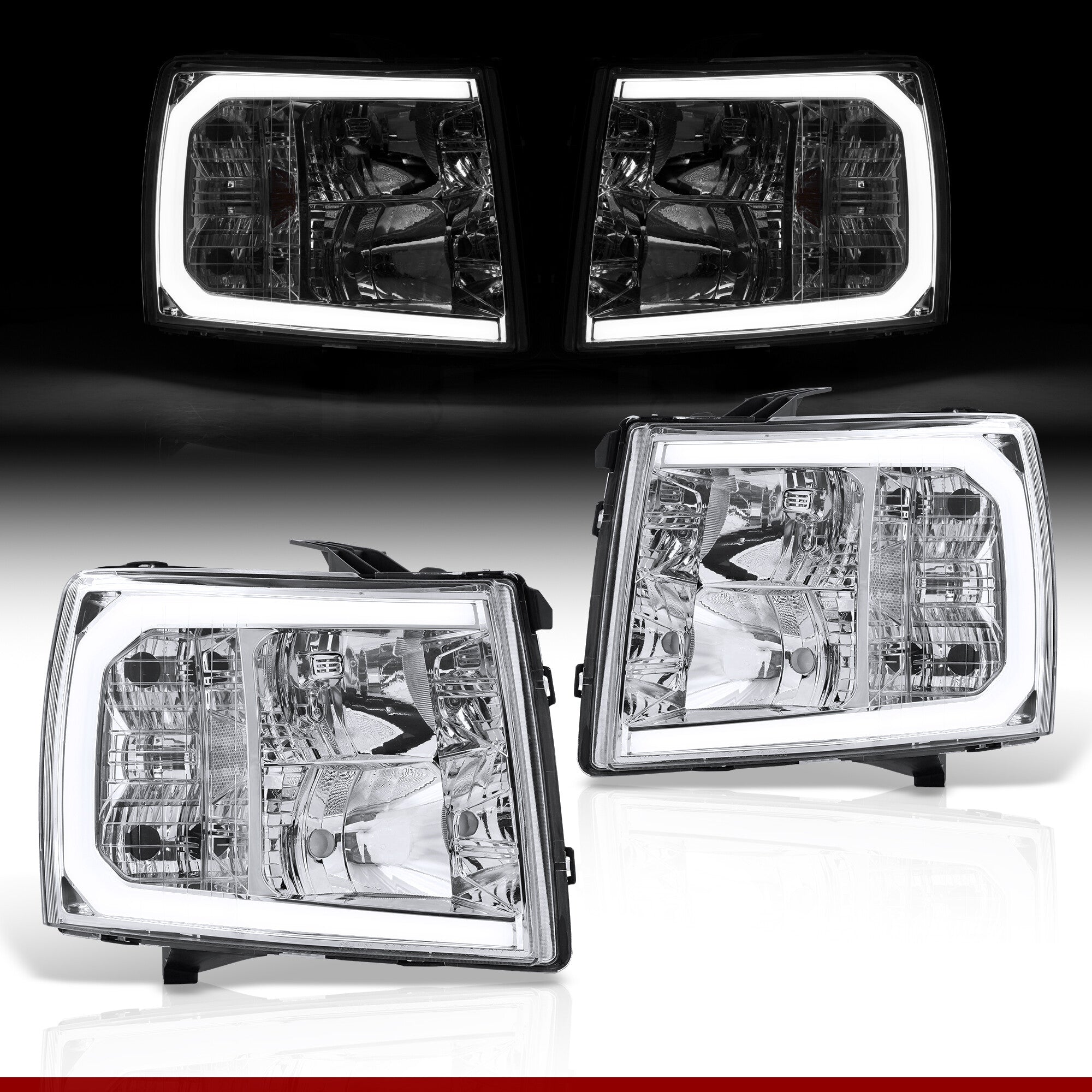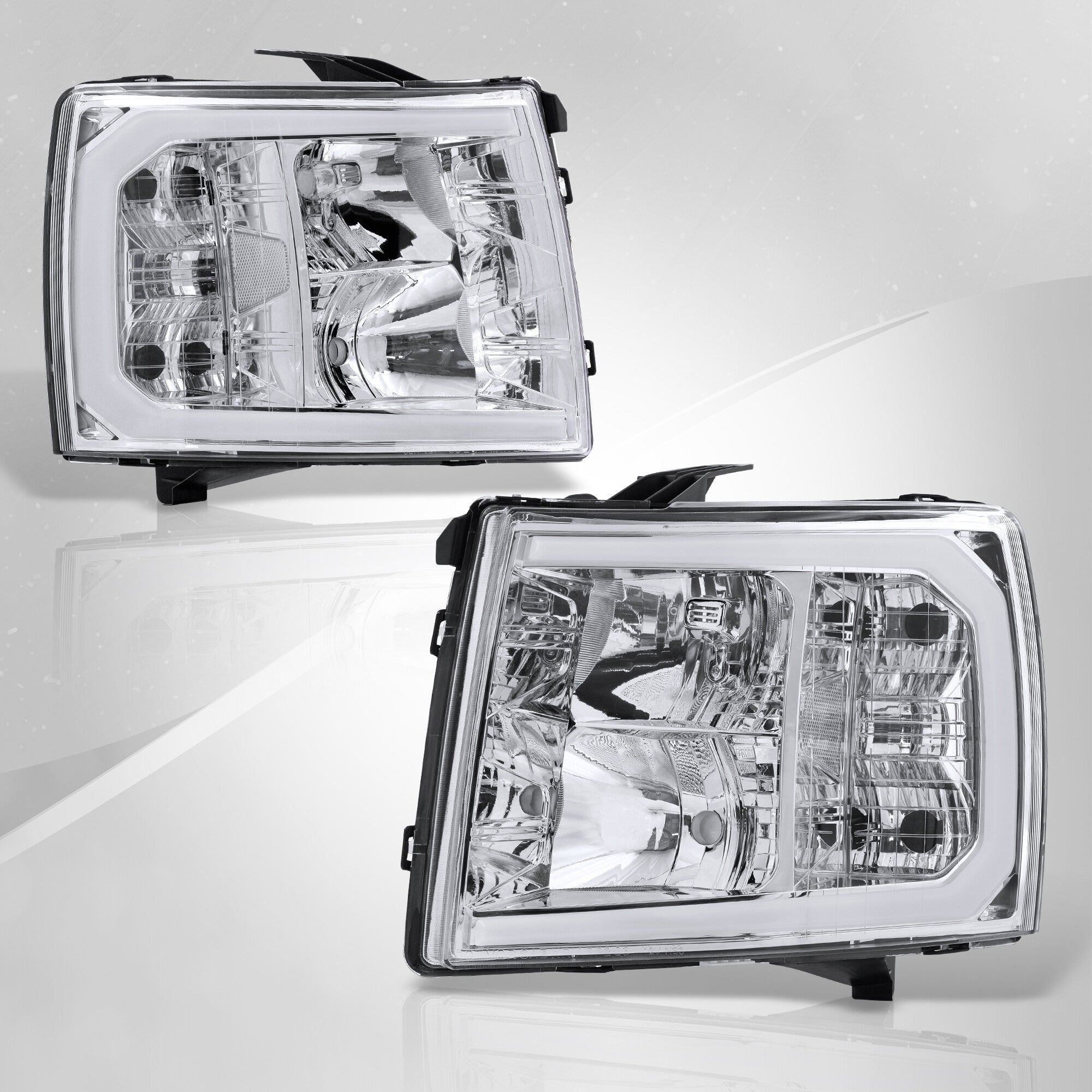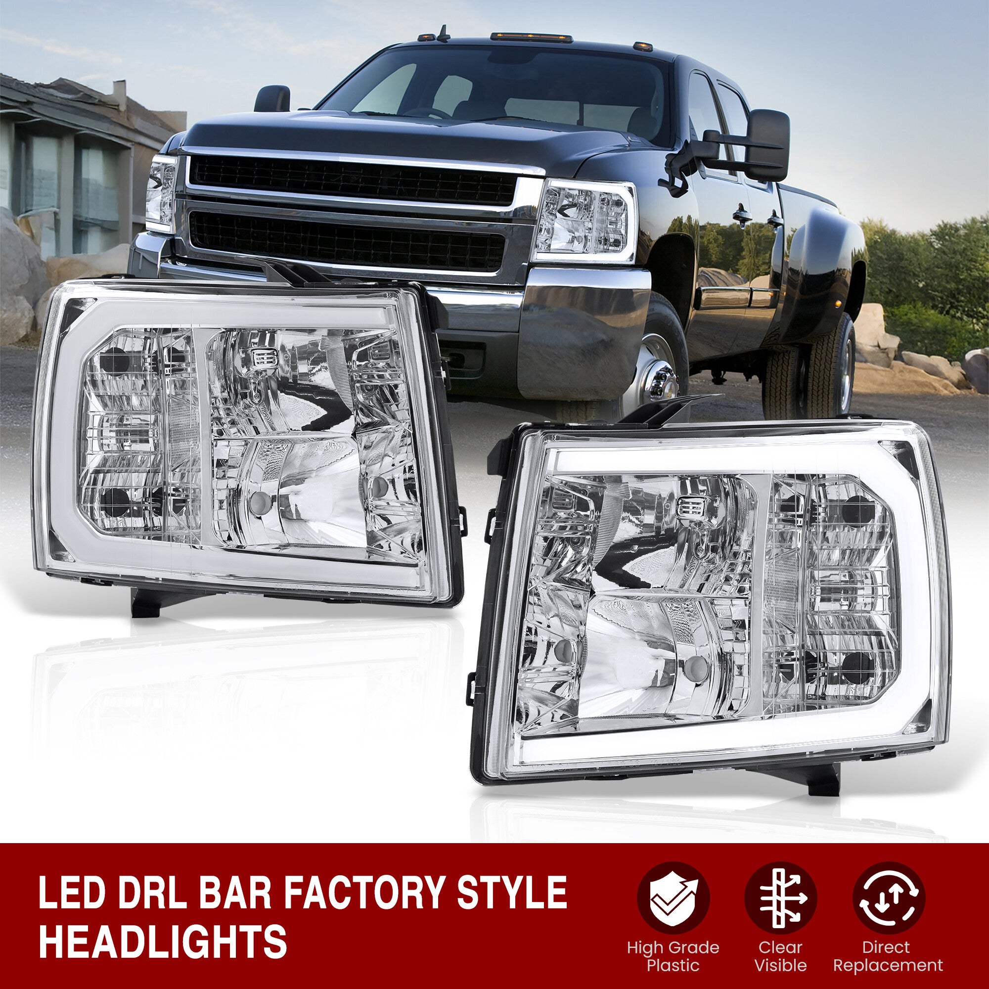 Chevrolet Silverado 2007-2013 LED DRL Bar Factory Style Headlights Chrome Housing Clear Len Clear Reflector