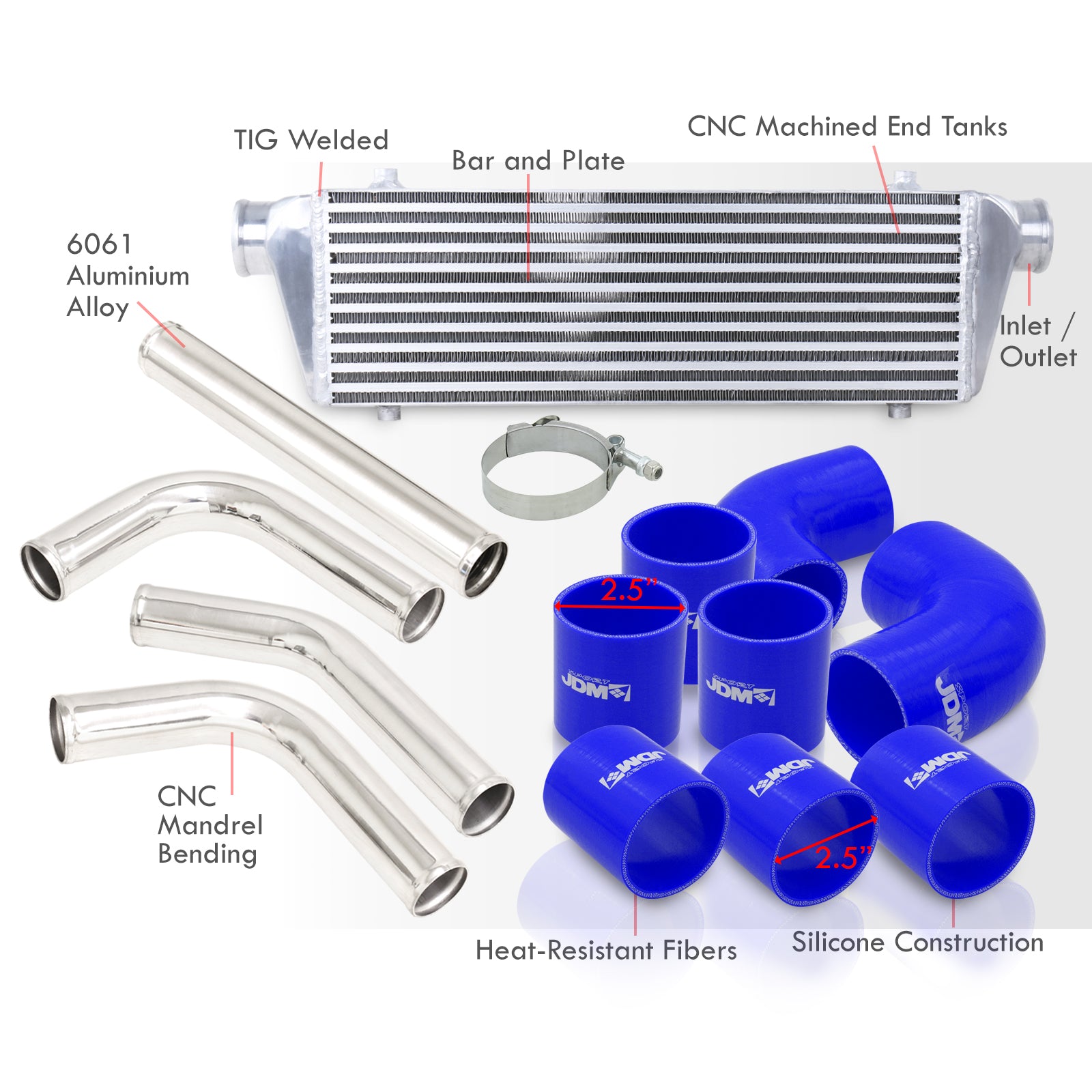 Universal 2.5" 8 Pieces Aluminum Piping Kit Polished (x2 Straight / x2 90 Degree / x2 120 Degree / x2 135 Degree) + Silicone Couplers Blue + Universal Aluminum Intercooler (Bar & Plate | Overall: 27.5" x 7.0" x 2.5" | Core: 21.5" x 7.0" x 2.25")