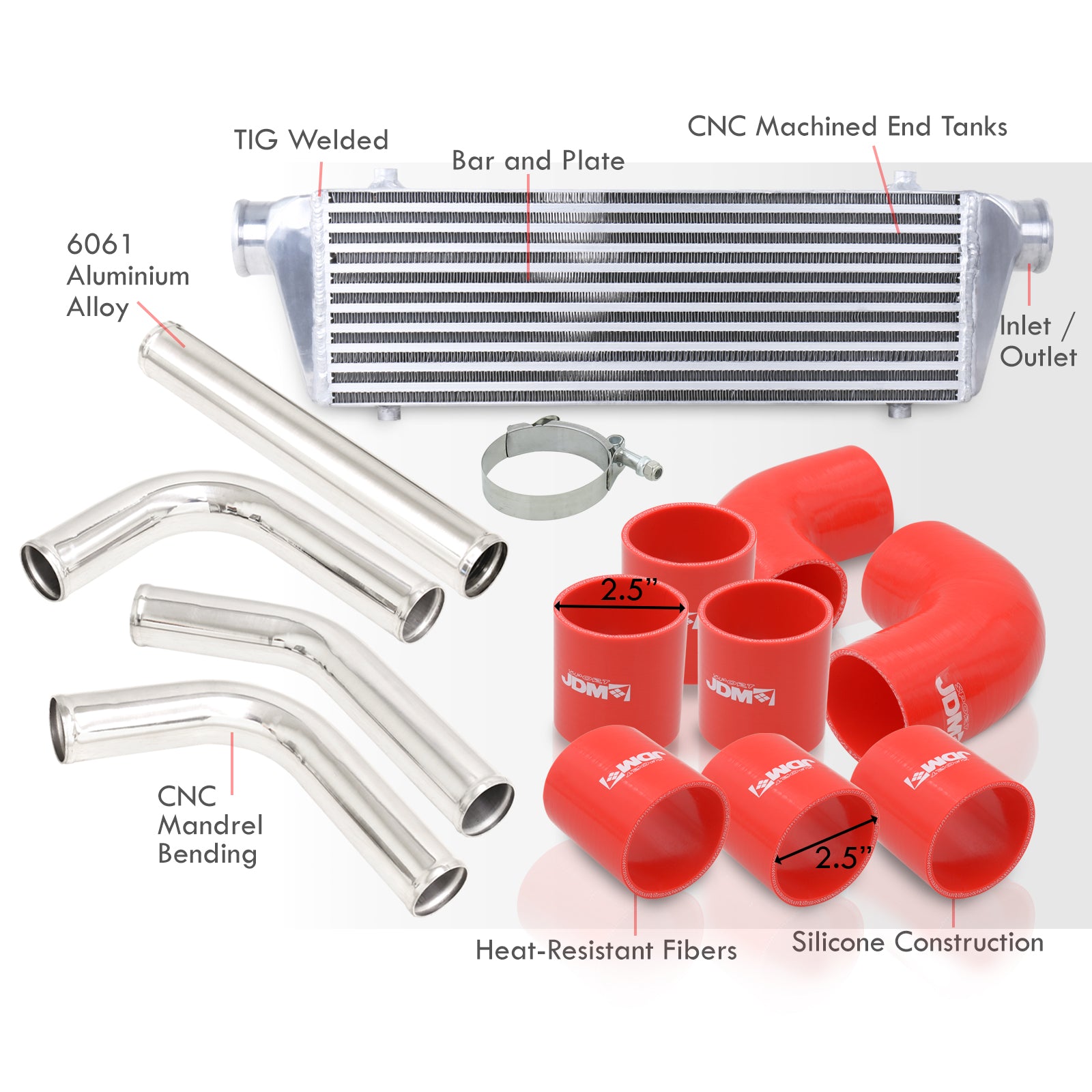 Universal 2.5" 8 Pieces Aluminum Piping Kit Polished (x2 Straight / x2 90 Degree / x2 120 Degree / x2 135 Degree) + Silicone Couplers Red + Universal Aluminum Intercooler (Bar & Plate | Overall: 27.5" x 7.0" x 2.5" | Core: 21.5" x 7.0" x 2.25")