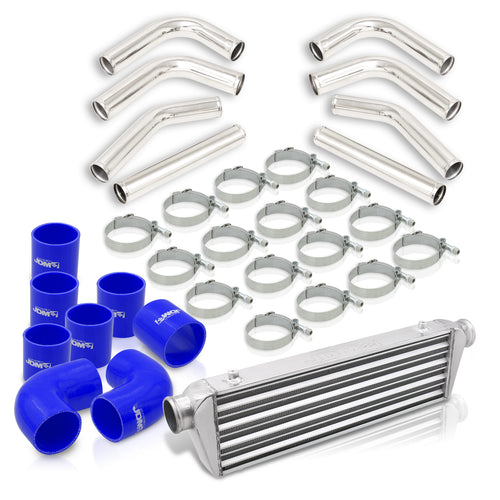 Universal 2.5" 8 Pieces Aluminum Piping Kit Polished (x2 Straight / x2 90 Degree / x2 135 Degree / x2 U-Pipe) + SIlicone Couplers Blue + Universal Aluminum Intercooler (Tube & Fin | Overall: 27.5" x 7.0" x 2.5" | Core: 21.5" x 7.0" x 2.25")