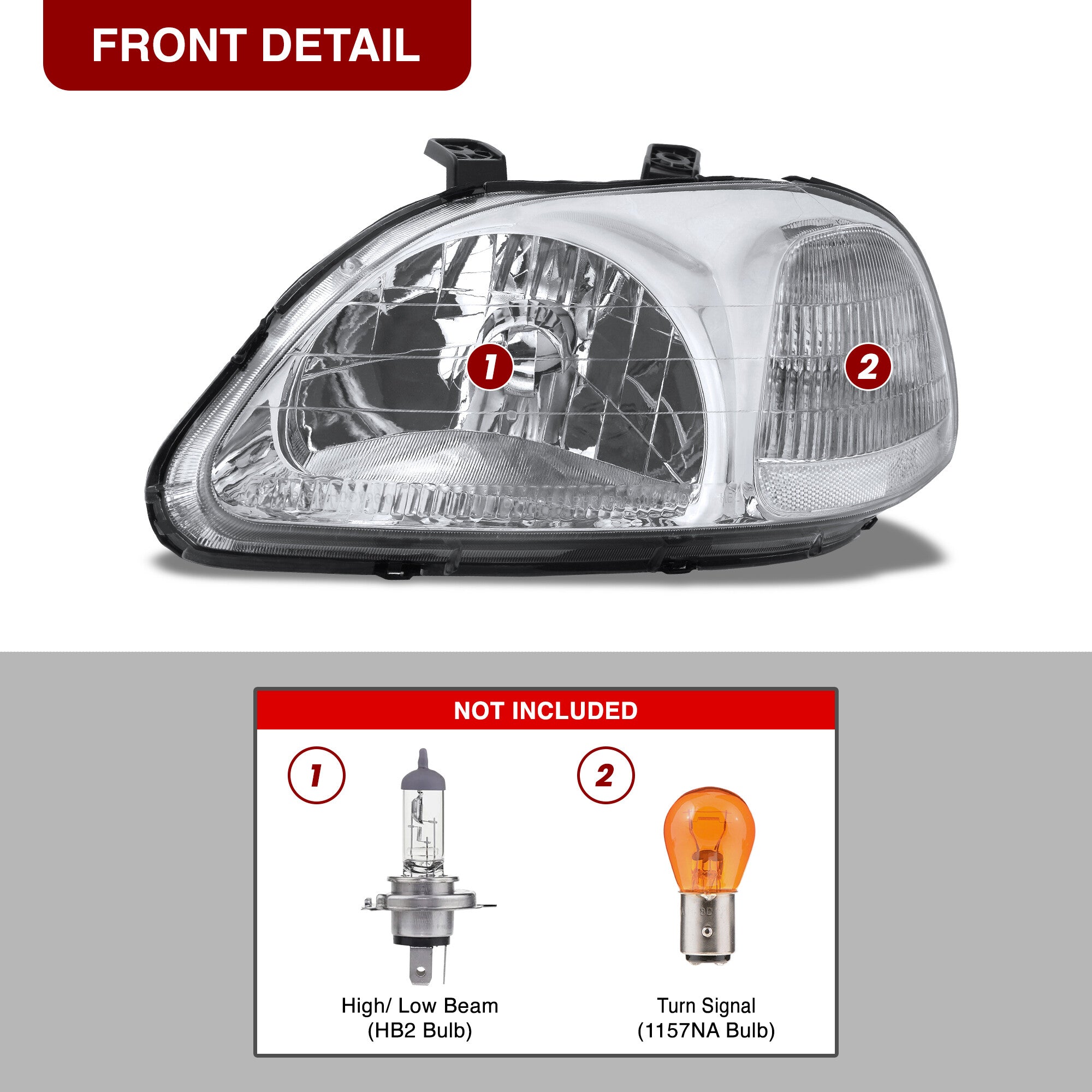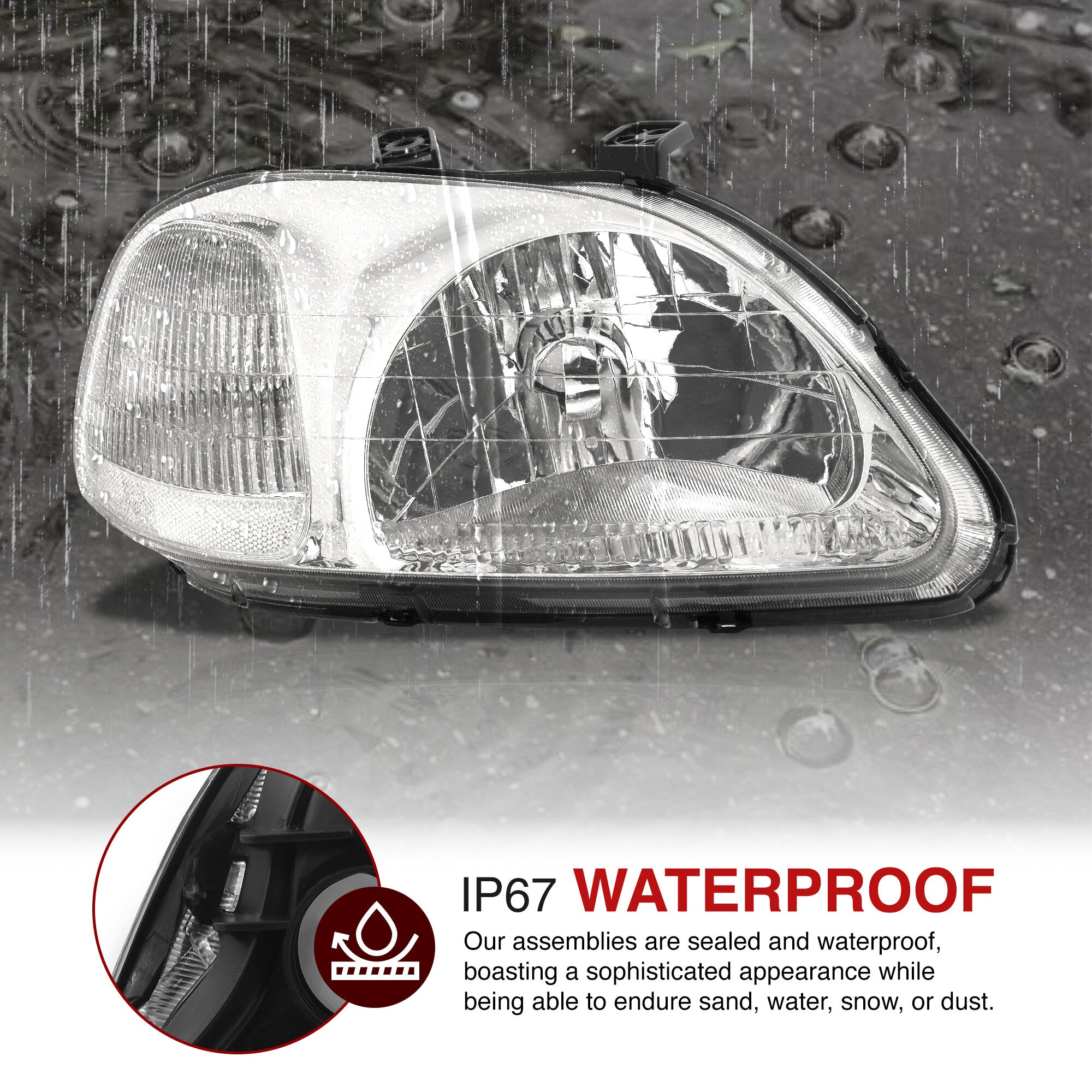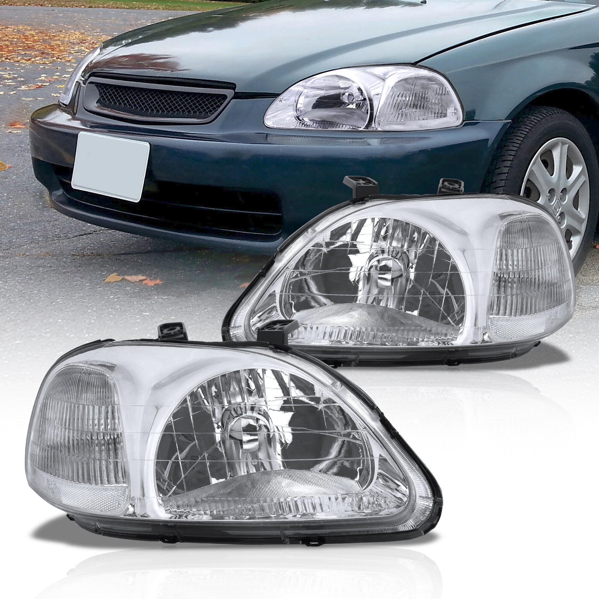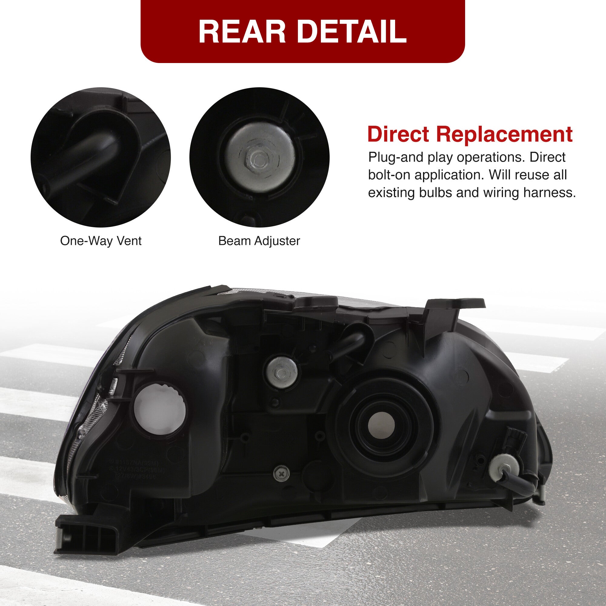- Direct replacement factory style headlights.