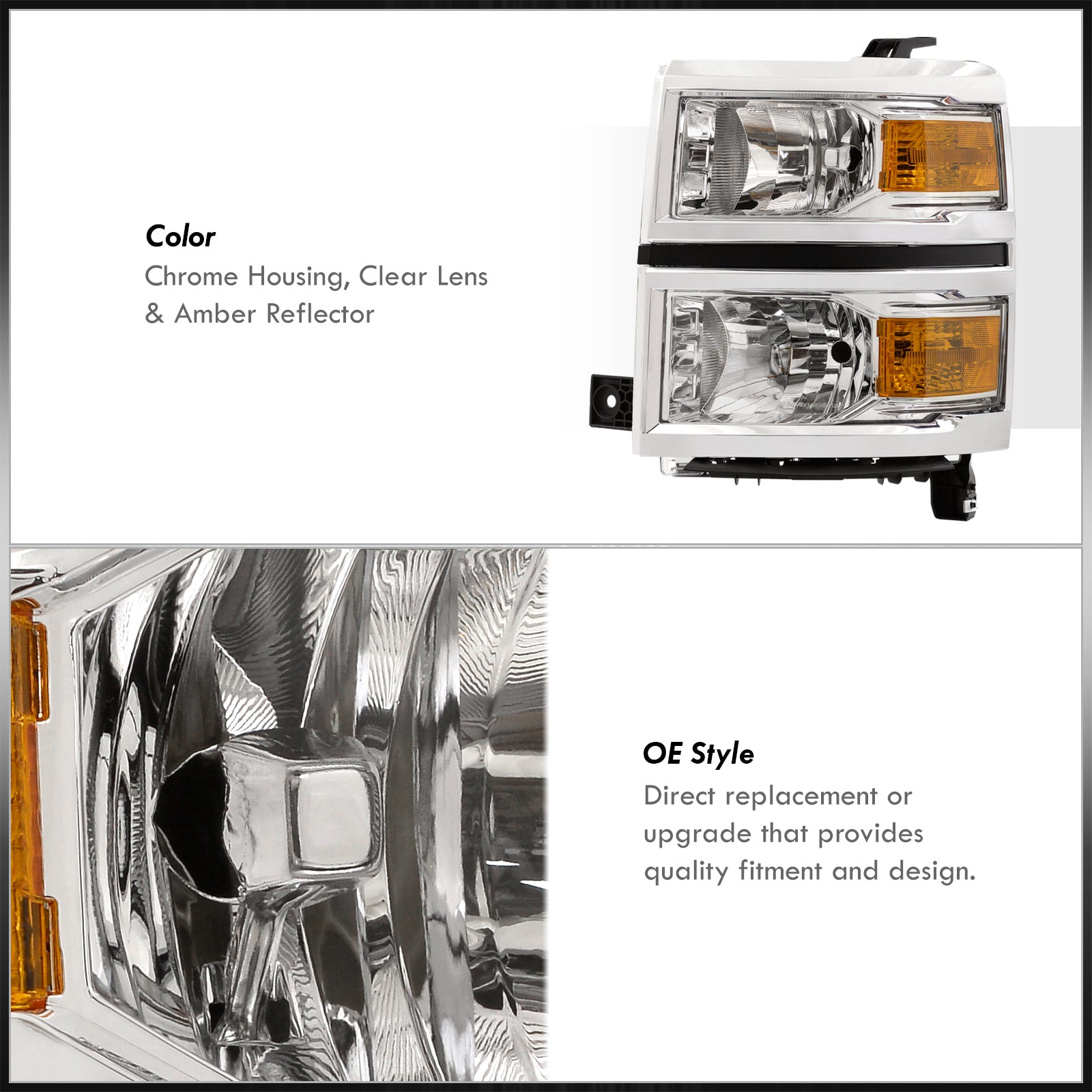 - Direct replacement factory style headlights.
