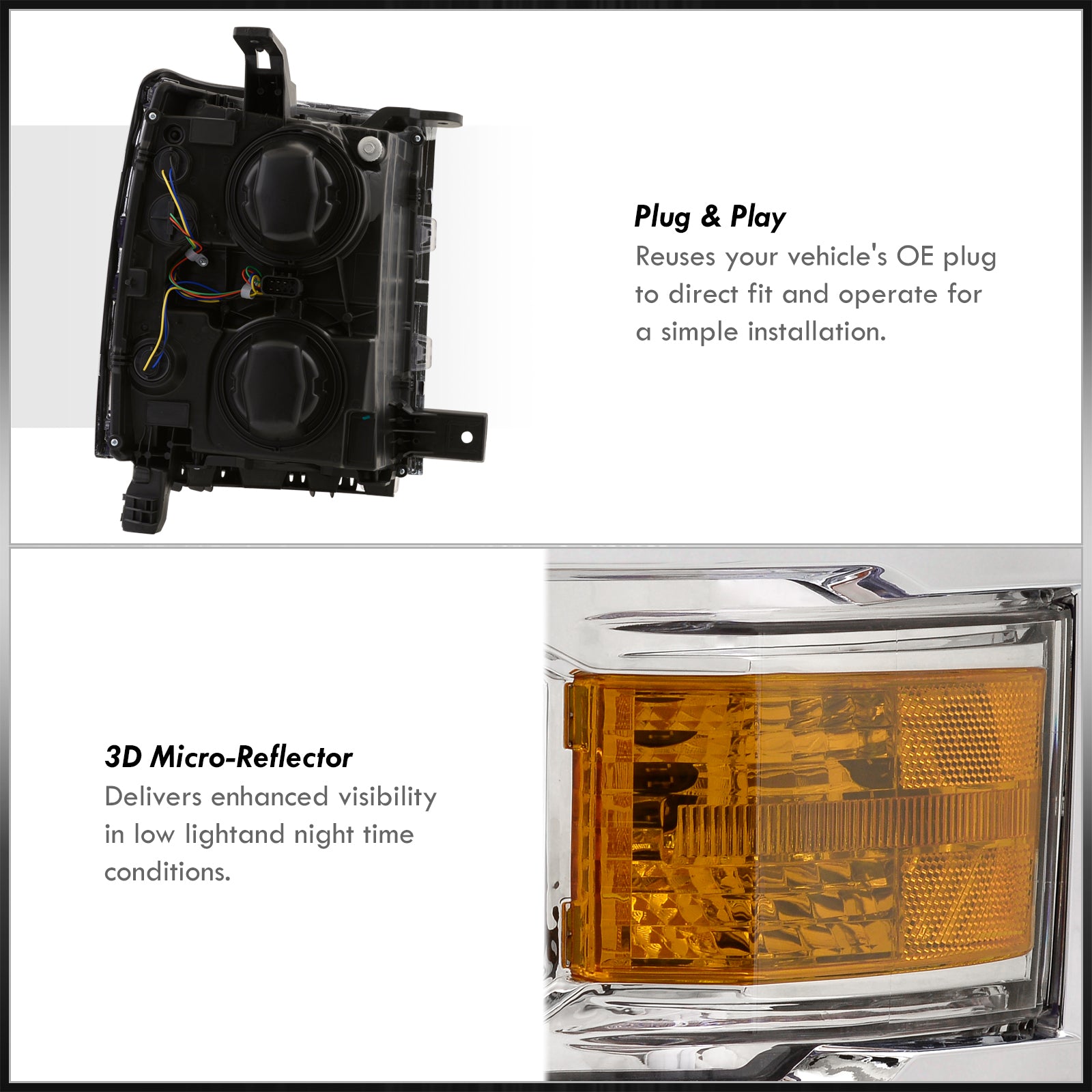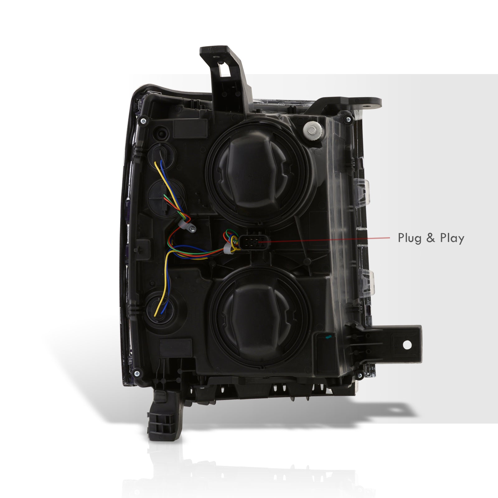 - Simple plug and play operations; no modifications required. Reuses factory mounting tabs for a 100% OEM look.
